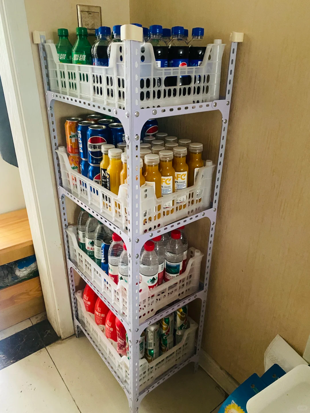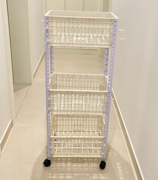 如果想要拿取更加方便,空间不是足够大,也可以将水果筐摞放在一起,然后把中间打开,这样就变成了一个可以移动的置物架。