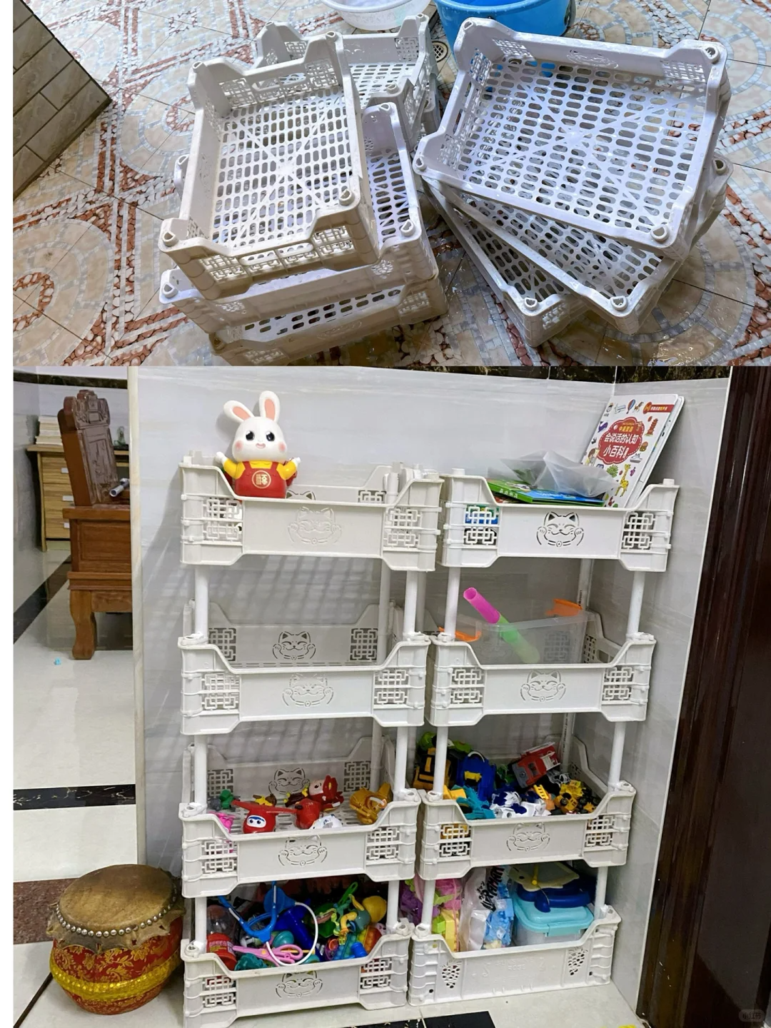 家里有孩子的玩具特别多,这些玩具总是散落在各处,收纳起来特别麻烦,也不用花钱去买收纳筐,其实我们可以用买水果的时候送的水果筐,刷洗干净之后,就来当做家里的玩具收纳筐,