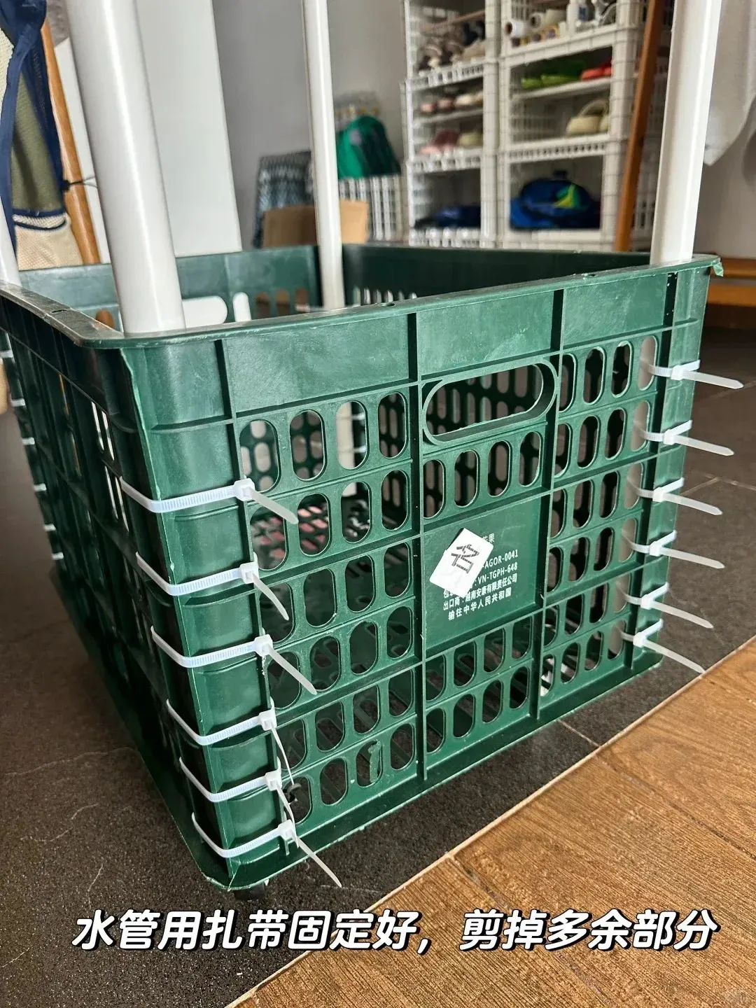然后再把水管使用扎带固定好,剪掉多余的部分,家里如果没有这种pvc的水管,也可以使用钢管、木棒