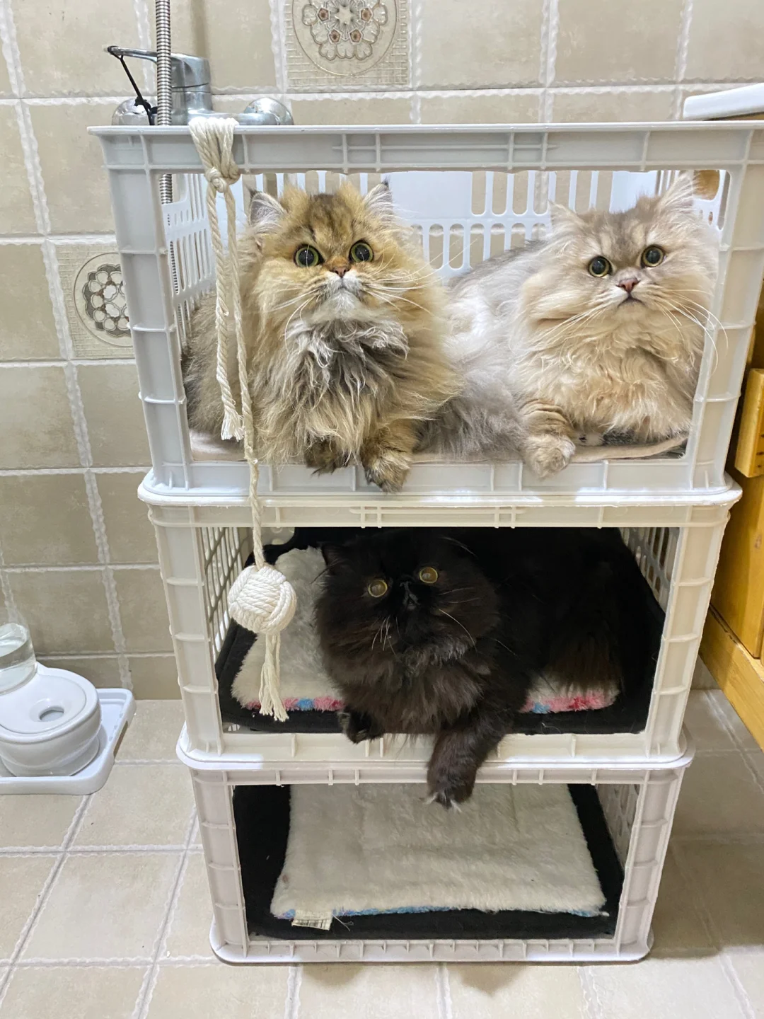 如果有好几只猫,你可以将水果筐的中间打开,然后把三个水果筐摞在一起,里面铺上垫子,就变成了一个楼房猫窝。