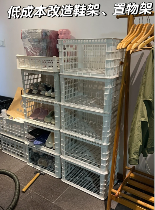 要把水果放中间掏空,然后把几个水果筐摞在一起,这样脱下来的鞋子就可以放在里面收纳了,回家的时候直接扔掉,也不会心疼。