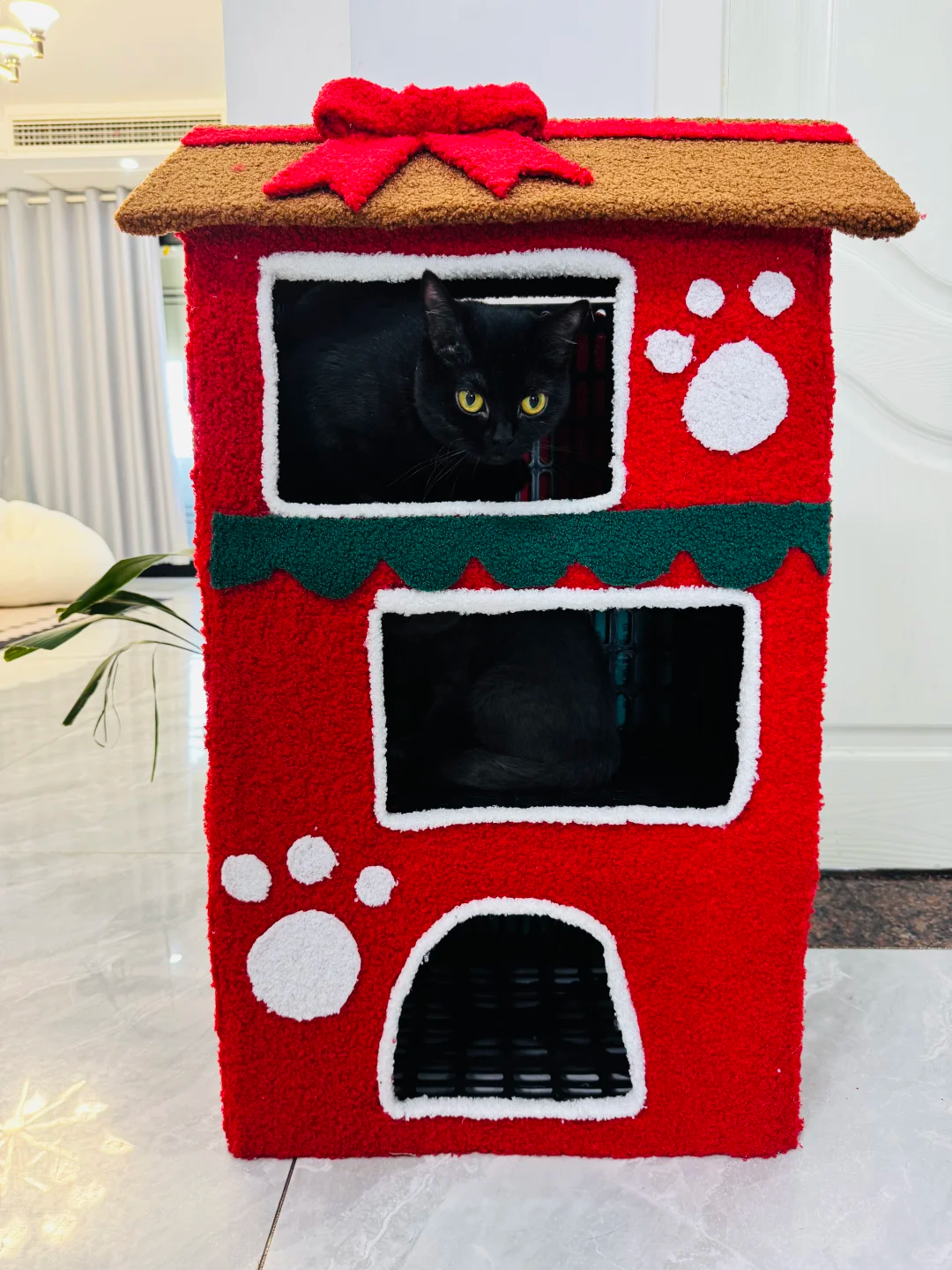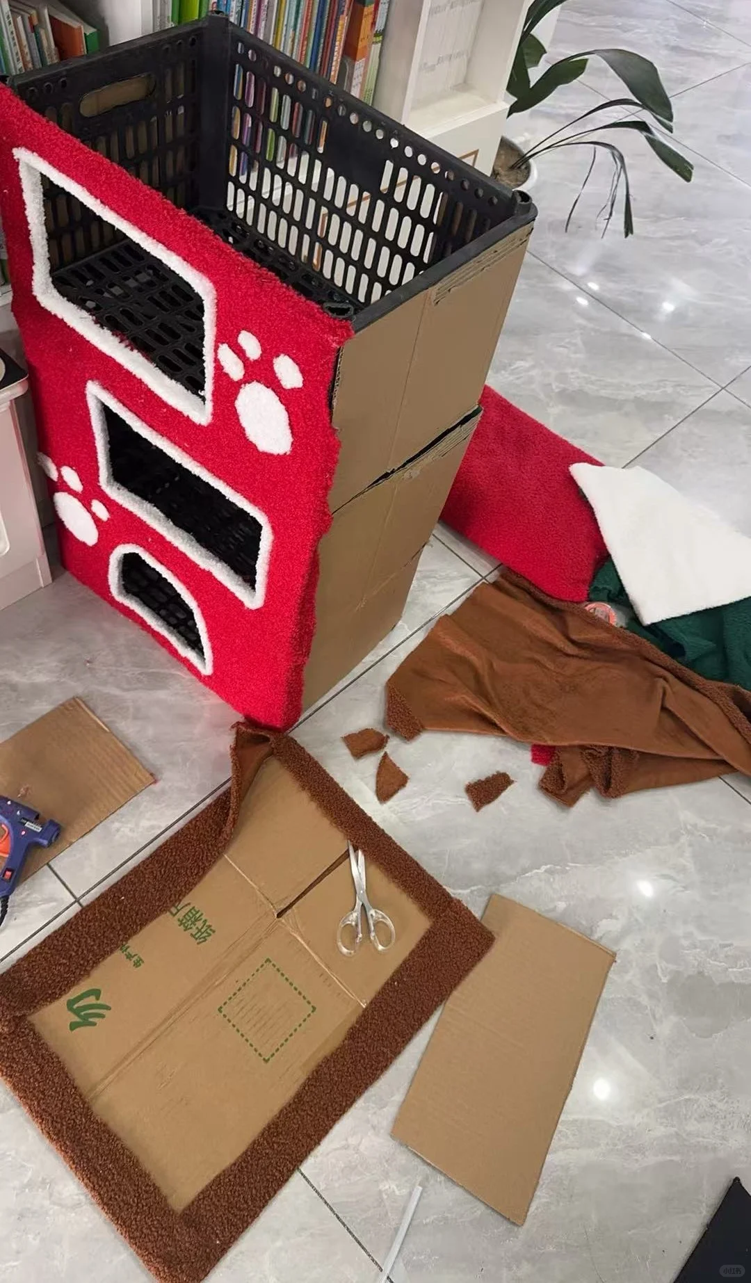 这样看上去是不是就高大上了很多,根本看不出来,竟然是用水果筐改造的猫窝,家里有好几只猫的,赶紧给猫添置一个大house。