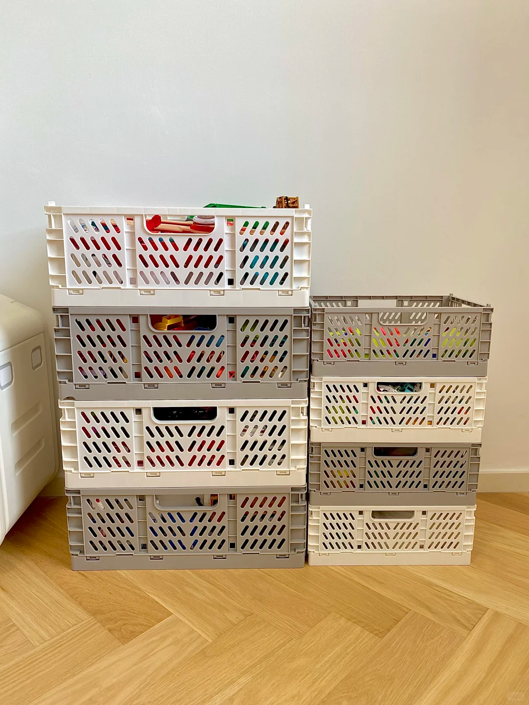 没花一分钱,关键是容量也足够大,可以将水果筐叠加一起收纳,我家里也没有那么多水果筐,可以在经常买水果的水果店跟老板要一个,
