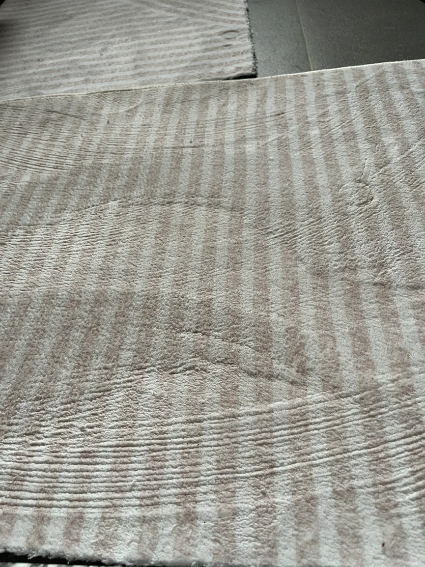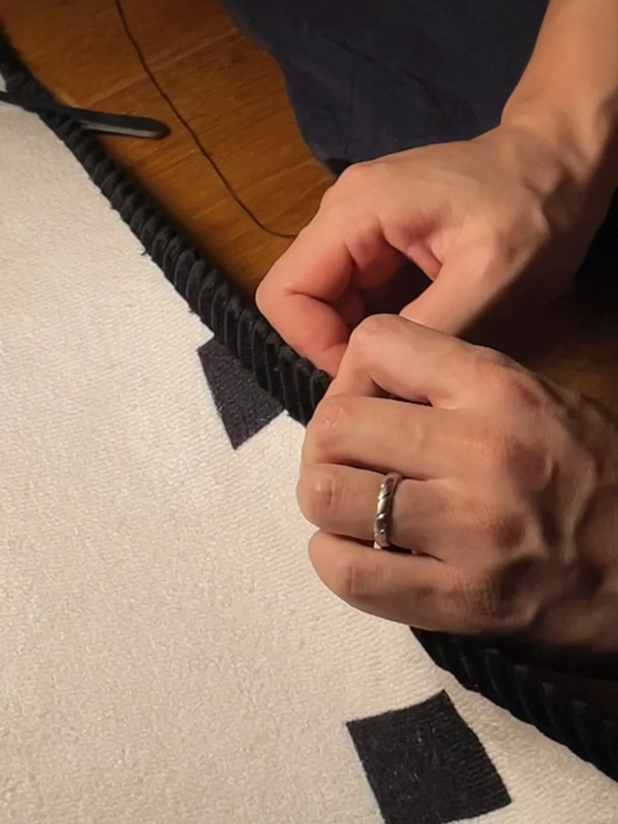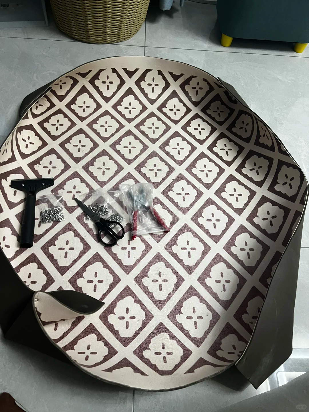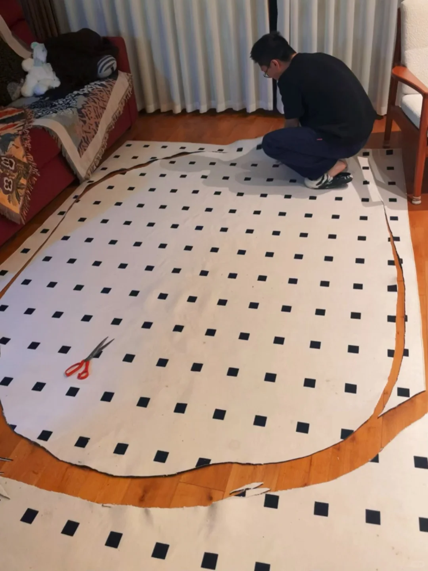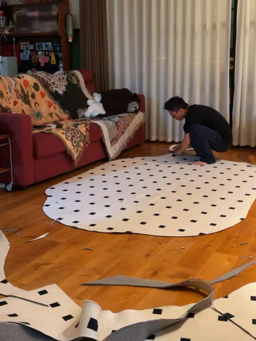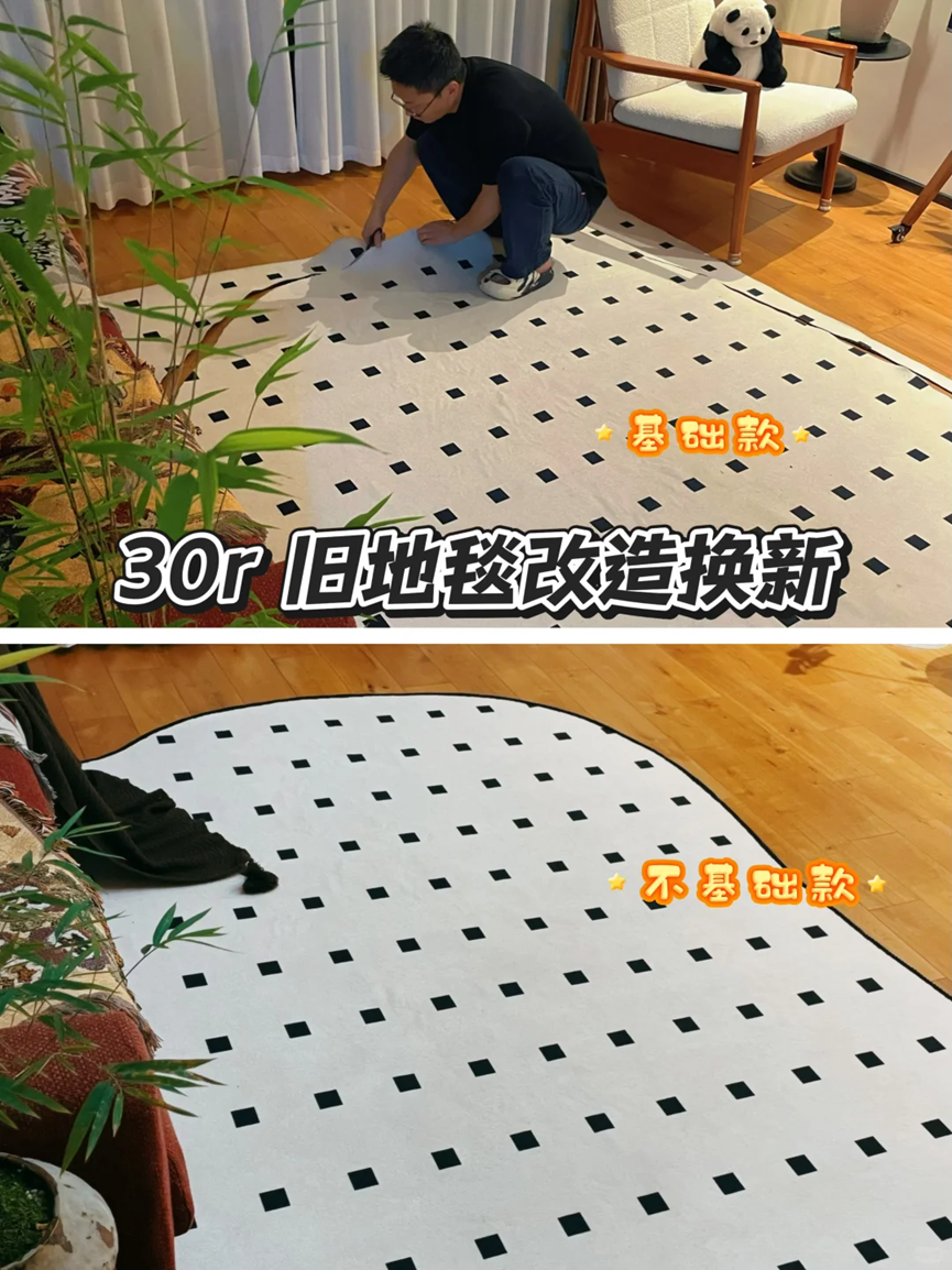 她老公看了之后感觉这样扔掉实在是太可惜了,就开始进行修修剪剪,将原来的旧地毯进行了一番改造换新。