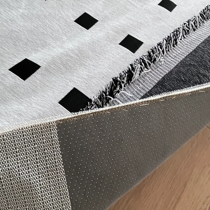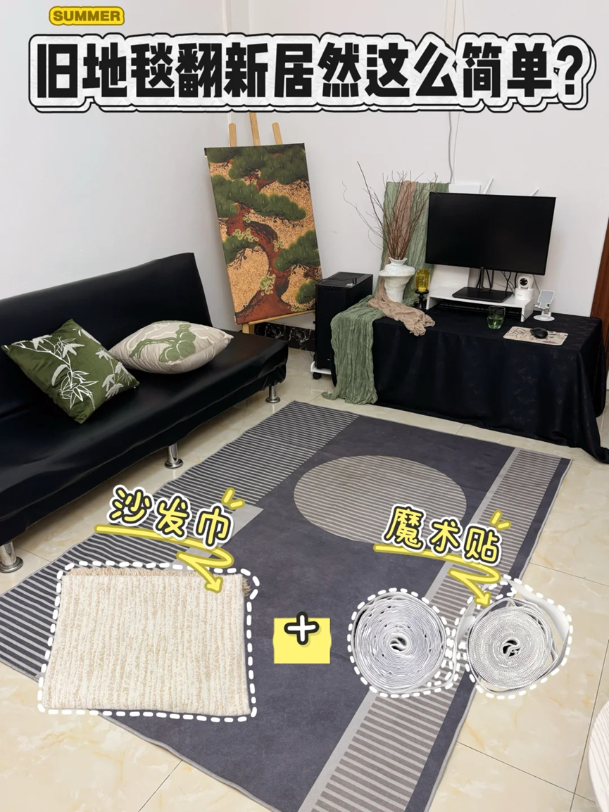 而且这样改造之后的地毯更好拆洗,脏了之后,只需要将上面的沙发巾拿下来清洗干净就可以了。
