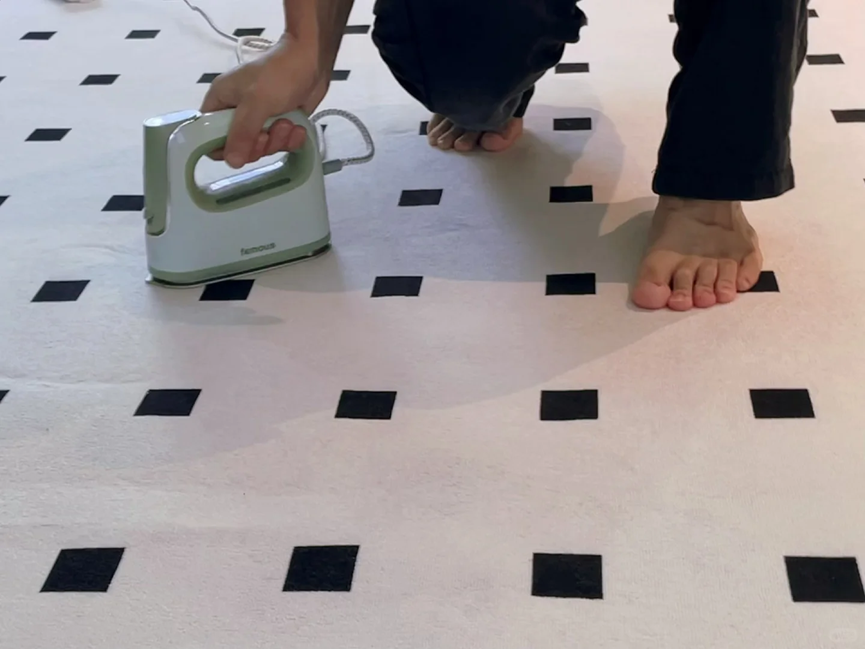 将旧地毯表面的灰尘和头发清理干净之后,铺平,将魔术贴贴在四角和边缘的位置,