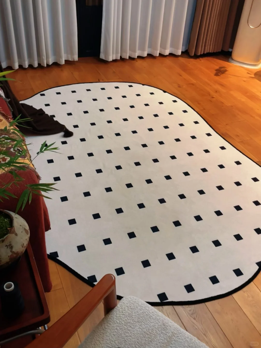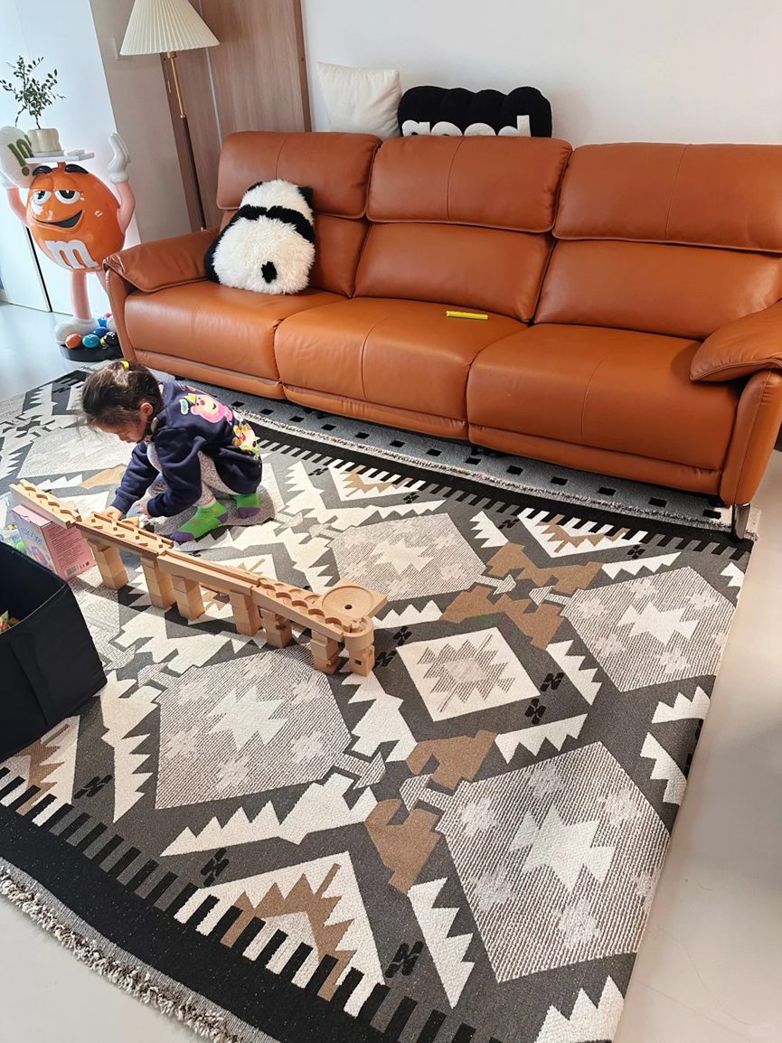 如果大家家里面也有尺寸比较大的旧地毯,那么也可以自己动手将其裁剪成不规则的形状,然后将边缘进行一下封边处理,这样就变成了一个非常独特的新地毯。