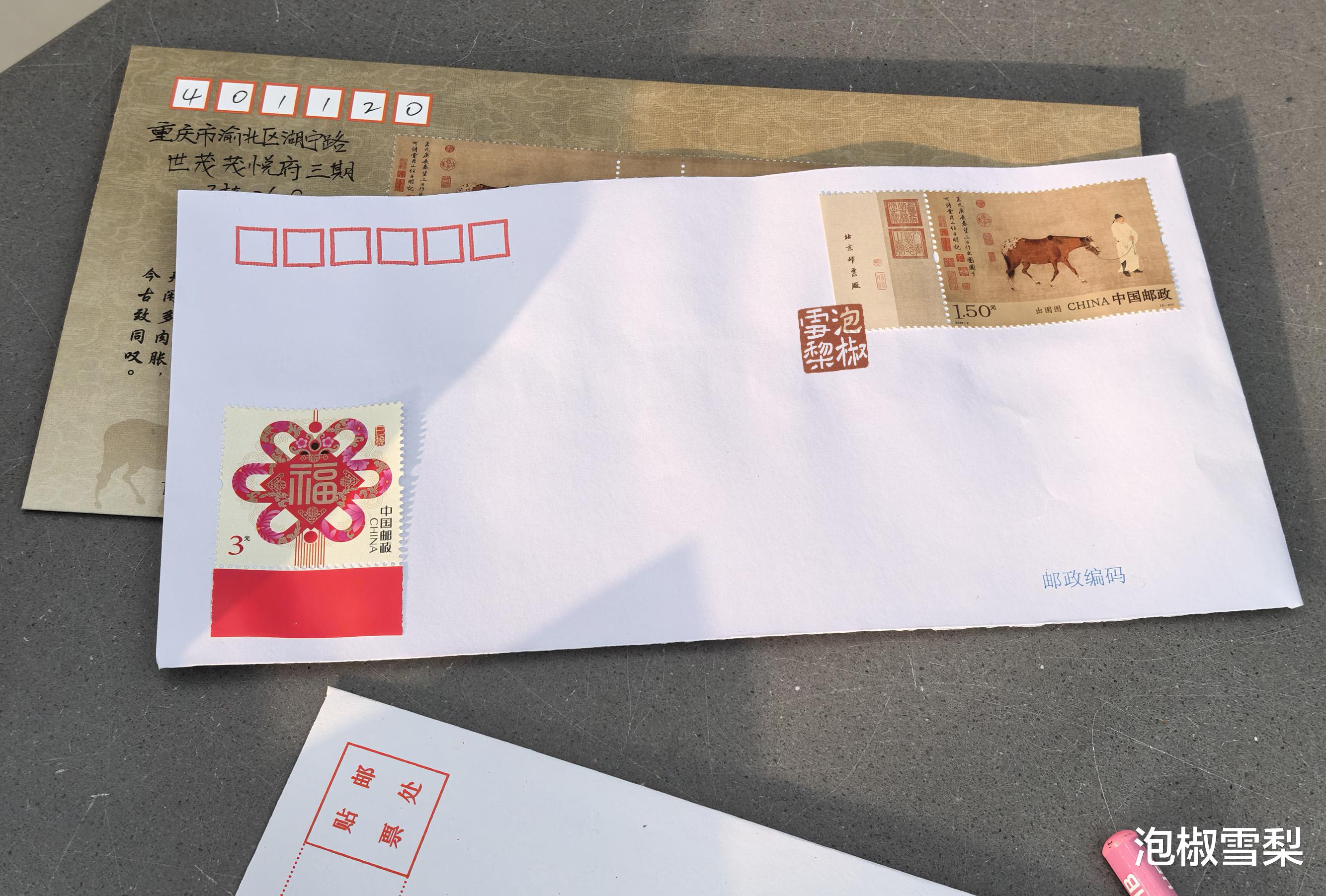 超过100克的信件,每增加100克收取邮费2元,如果选用1号标准信封,那么正面只能容下1版无齿大版和1套有齿邮票,总面值为19.5元。