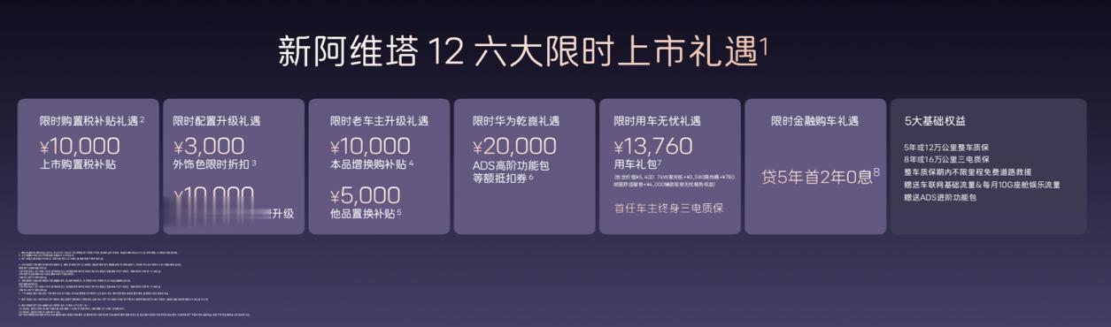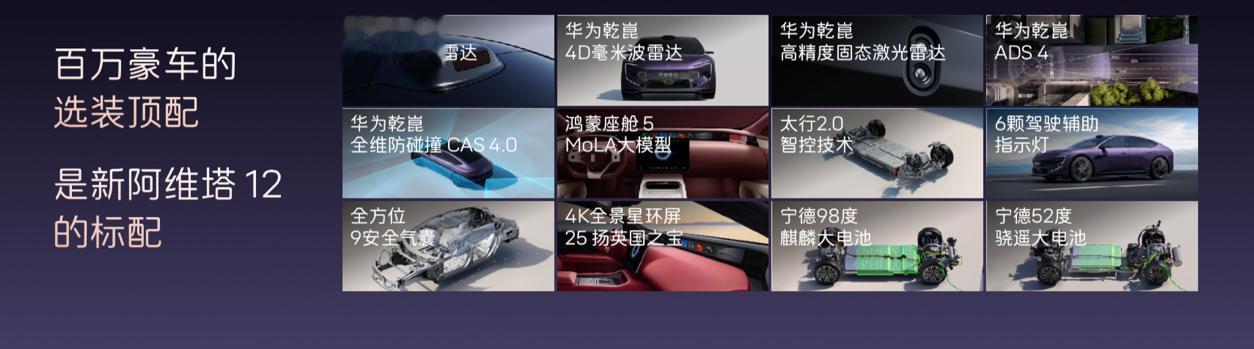 新阿维塔12定位未来智能豪华轿车,面向时代精英人群,主打豪华、智能、旗舰级出行体验。新车全系标配12项顶格配置,涵盖华为乾崑智驾全系统、太行智控2.0、35.4英寸4K全景星环屏、25扬英国之宝音响、全车9安全气囊等,百万豪车顶配选装功能悉数标配。同时推出六大限时购车礼遇,购置税补贴礼遇、配置升级礼遇、老车主升级礼遇、ADS高阶包抵扣权益、贷5年首2年0息金融礼遇、万元用车无忧礼遇,入门即满配,彻底打破豪华门槛。
