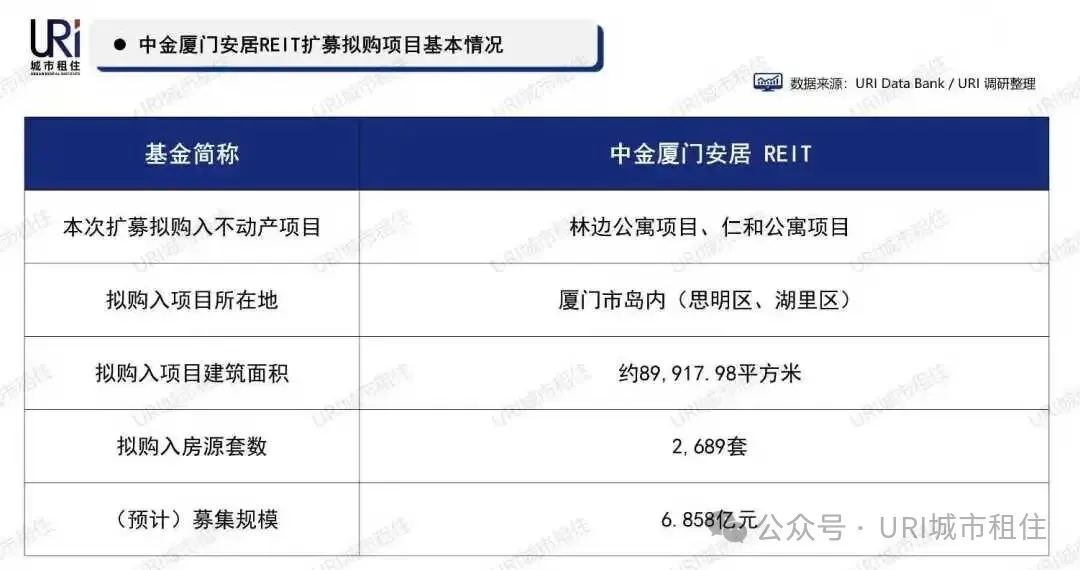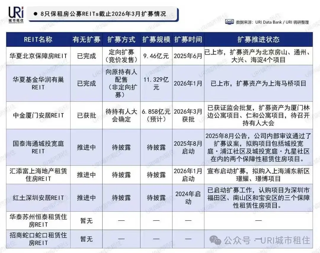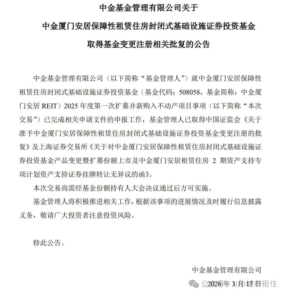 2026年3月17日,中金厦门安居REIT扩募申请获证监会核准,预计扩募规模6.858亿元,拟购入厦门市岛内两个公寓项目。中金厦门安居REIT也成为继华夏北京保障房REIT、华夏基金华润有巢REIT之后,全国第三单完成扩募的保障性租赁住房REIT。