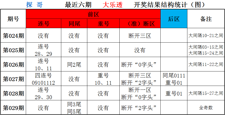 开奖号码结构:前区没有连号,两对同尾03、33和05、35,没有重号,断开“2字头”,全奇数。