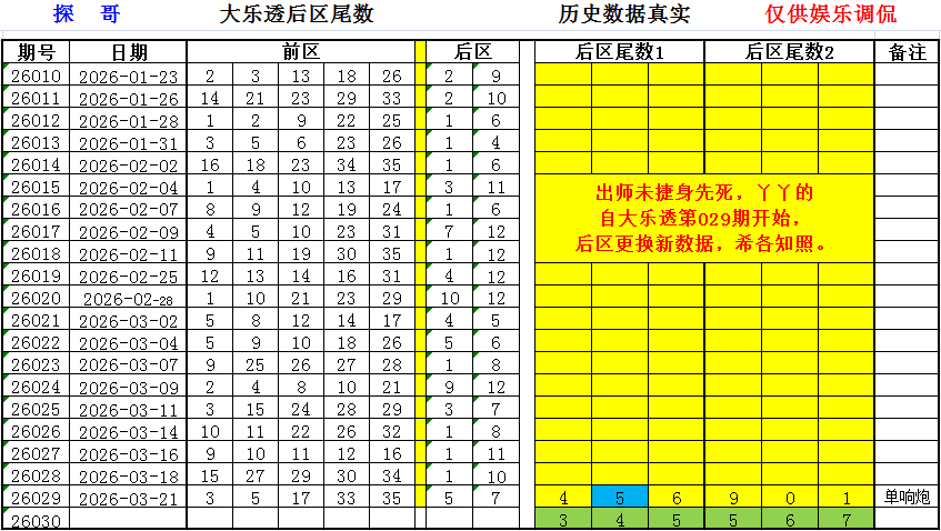 自大乐透第029期开始, 后区尾数更换新数据,希各知照。