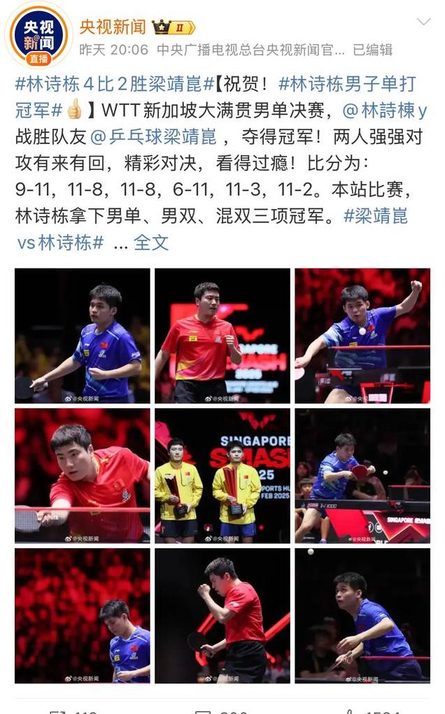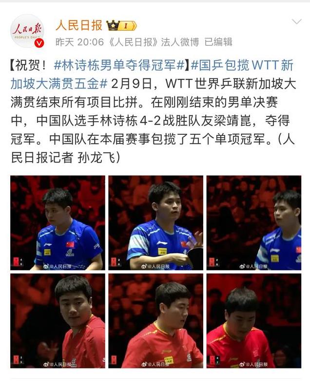 不得不说,林诗栋在WTT大满贯的比赛堪称完美且伟大。在林诗栋获得男单冠军后,央视新闻和人民日报也是第一时间发文祝贺,可见成绩的含金量。