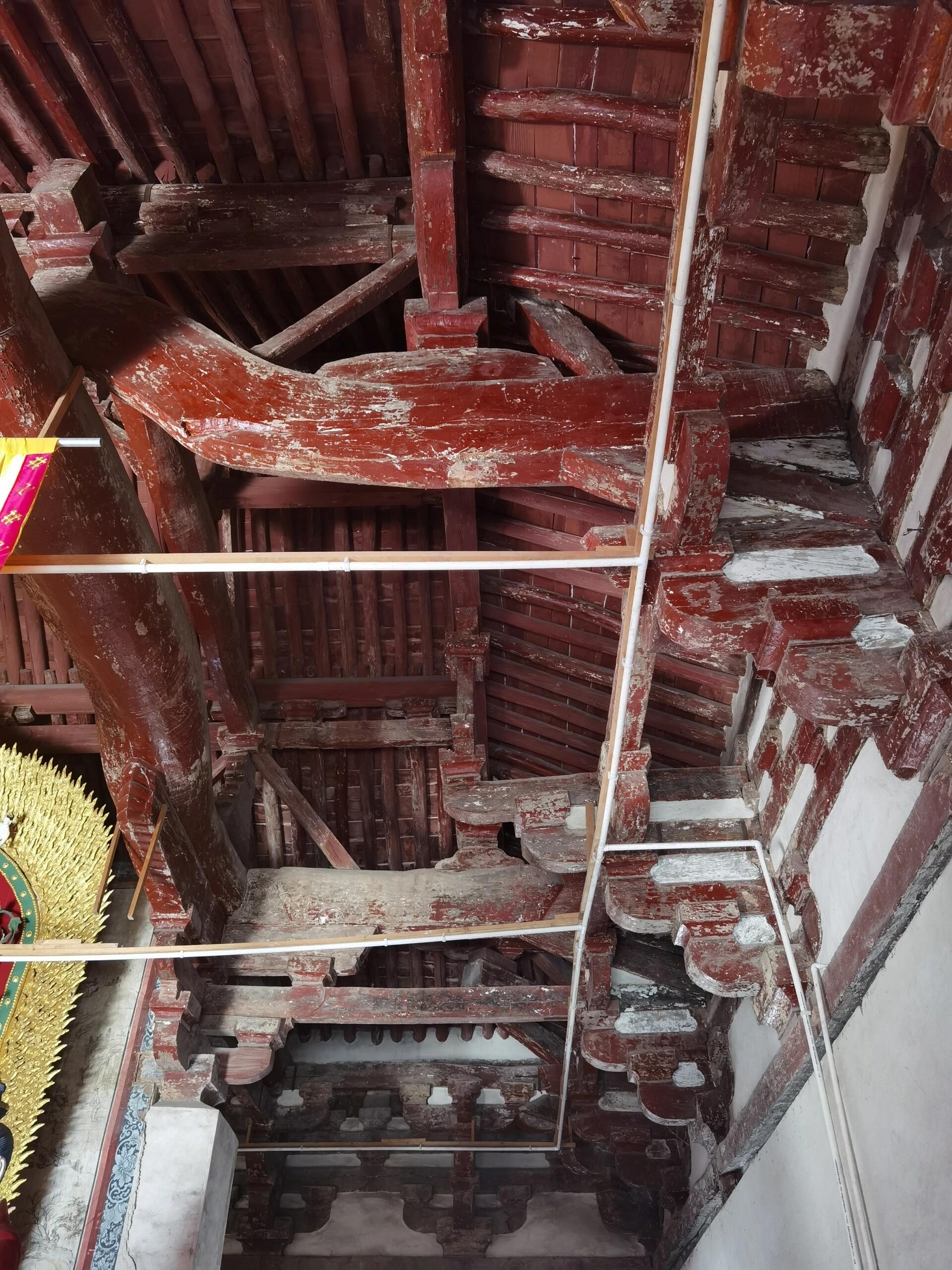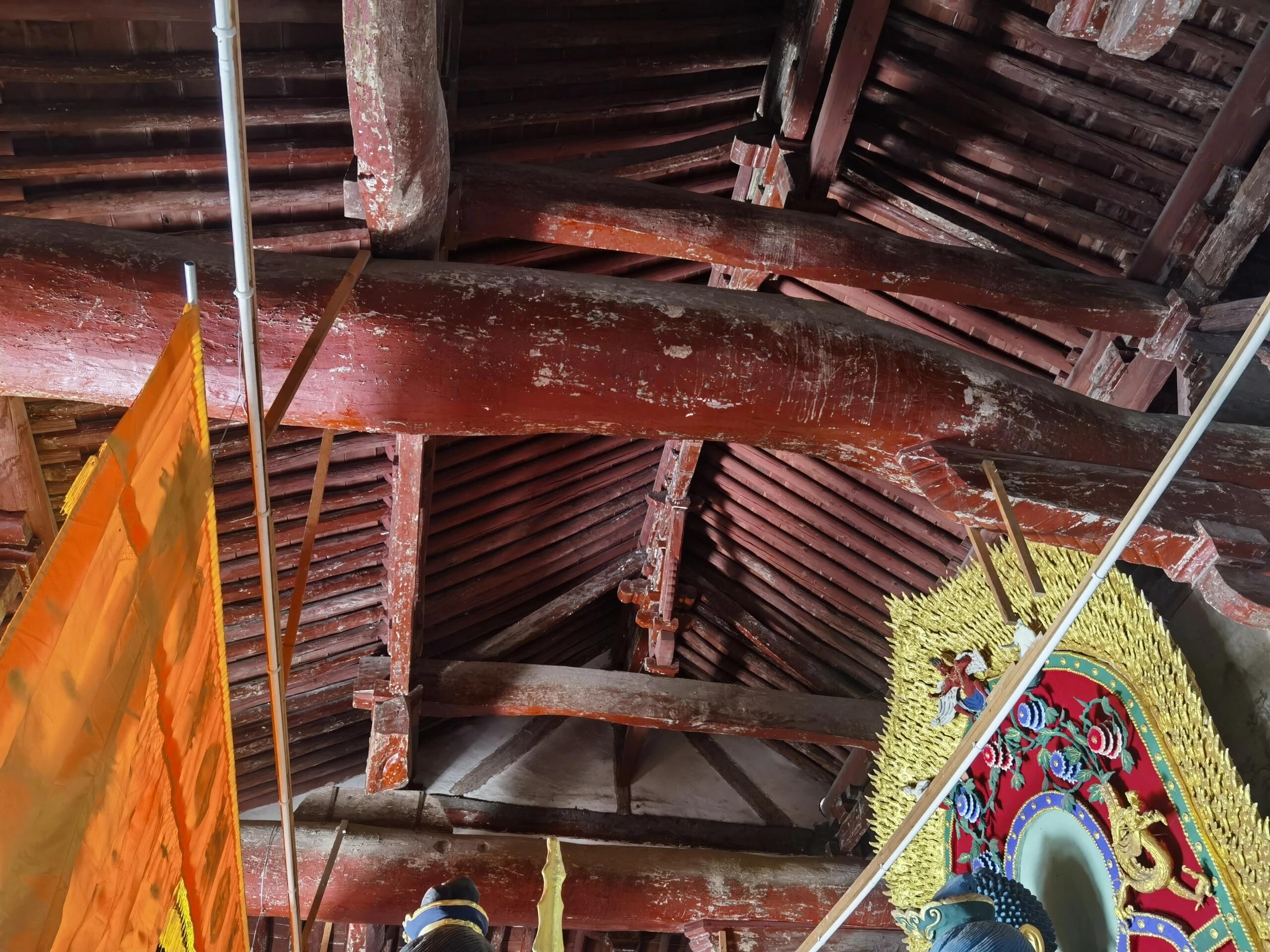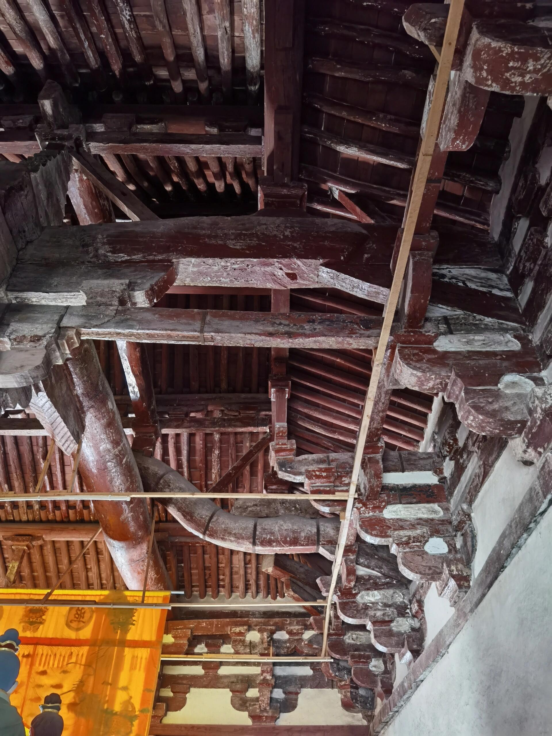 踏入殿内,梁架结构同样令人称奇。四椽栿后压乳栿通檐用三柱的设计,既保证了空间的开阔,又展现了古人对力学原理的深刻理解。里转耍头上出㭼头承四椽袱,每一处构件的交接都严丝合缝,没有多余的装饰,却透着一种质朴的美感。而最特别的,当属殿东、西两次间的大丁栿——工匠巧妙利用自然弯曲的木材,将其破开一分为二加工而成。这种因地制宜的做法,在别处难得一见,也只有在晋东南这片土地上,才能看到古人与自然如此默契的对话。