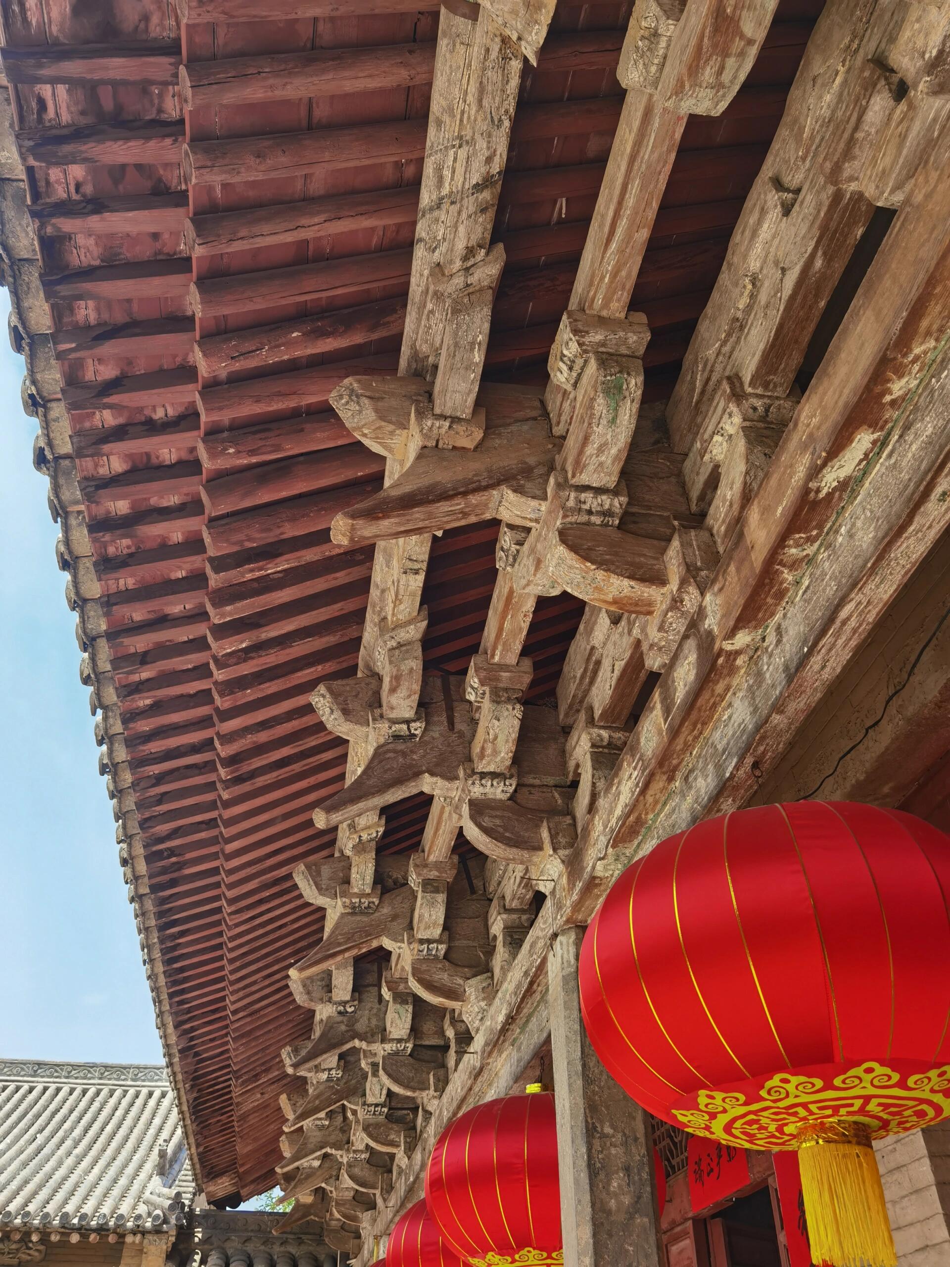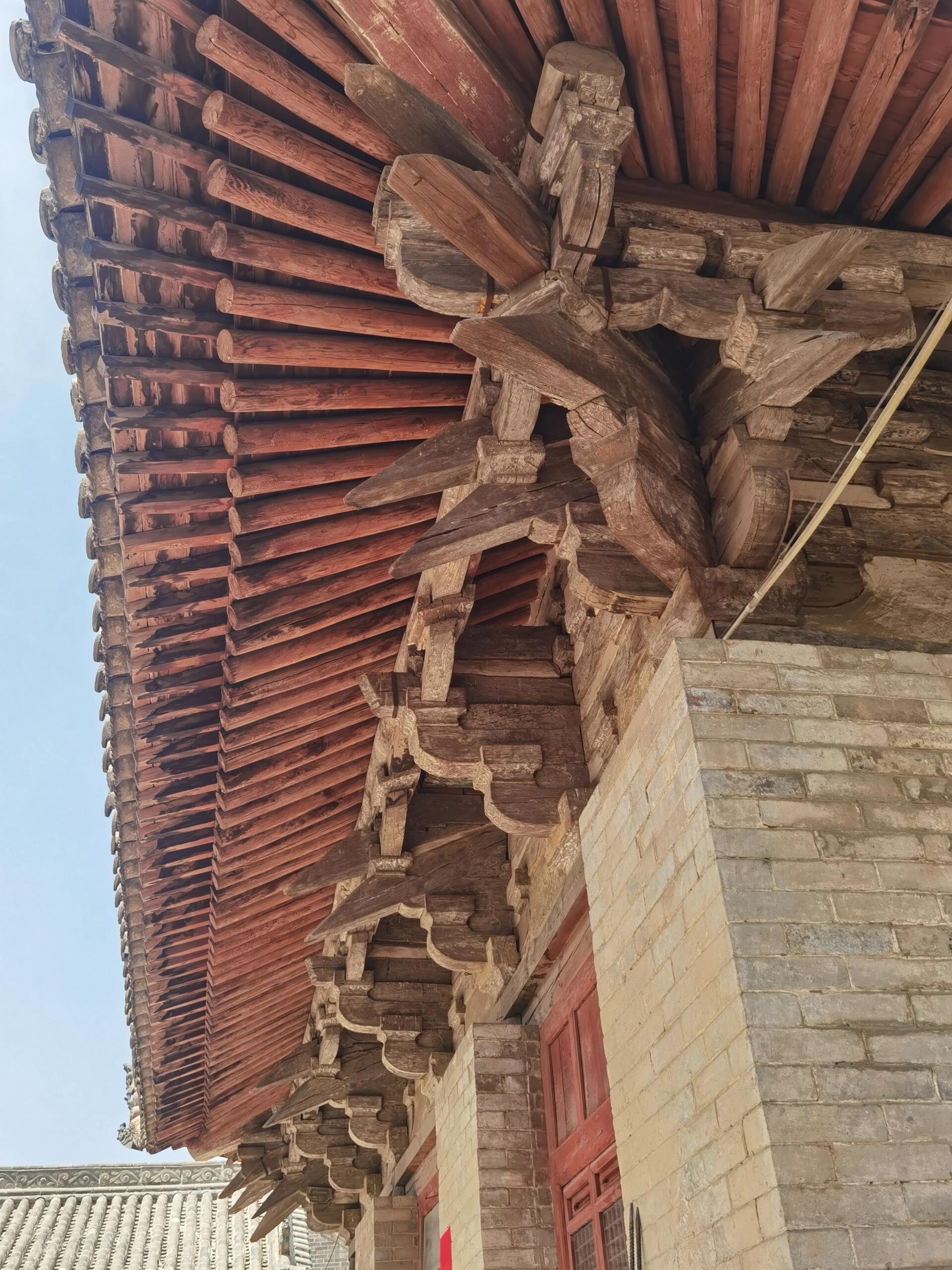 站在毗卢殿前,首先被其简洁而不失庄重的外观吸引。单檐歇山顶的曲线柔和舒展,没有明清建筑那般夸张的翘角,却自有一番沉稳含蓄之美。走近细看,柱头铺作采用五铺作单抄单下昂的构造,层层斗拱如飞鸟展翅般向外延伸。而最令人惊喜的发现,莫过于耍头均制作成昂形,也就是俗称的"批竹昂"。这种做法在现存古建筑中极为罕见,是目前已知最早的实例,为研究宋代建筑演变提供了重要的实物资料。