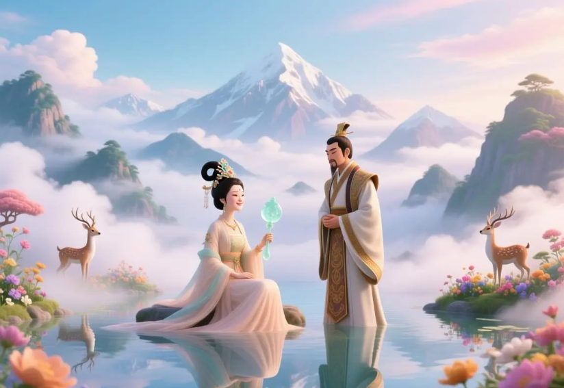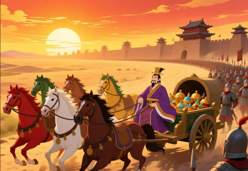 周穆王乘坐这八匹骏马拉的车子,从北方转到西方,到了许多地方。他到过阳紆山[纤yū],访问了水神河伯的家乡;到过巨蒐国[sōu],巨嵬国请他喝白天鹅的血;到过昆仑山,游览了当年黄帝住过的宫殿;到过赤鸟国,接受了该国国王奉献的美女;到过黑水河的支流,封赏了盛情接待他的长臂国国王。最后他到了西王母的国家。西王母听说周天子来作客,特地为他举行了热烈而隆重的欢迎仪式。会见时,穆王向西王母赠送织有花纹的绸缎一百匹、素色的绸缎三百匹。西王母高兴地收下了礼物,表示感谢,并邀请穆王参观了她的宫殿和花园。第二天,穆王临行前在瑶池举行了宴会。在宴会上,宾主频频举杯,作歌吟诗共颂友谊。宴会结束后,西王母邀请穆王登上弇[yǎn]山,眺望山下美丽的景色。穆王在弇山顶上的大石头上,刻了“西王母之山”五个大字,还和西王母一起,种了一棵槐树,作为此行的纪念和东西各族人民友好往来的象征。穆王还访问了西王母的属国和附近的许多国家,采集了许多当地的珍禽异兽,然后告别了西王母,满载着中亚和西北地区的特产和各族人民的深厚情意,回到了镐京。