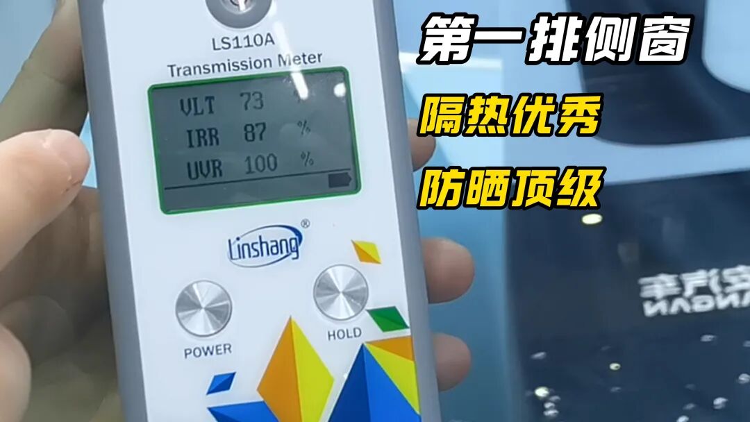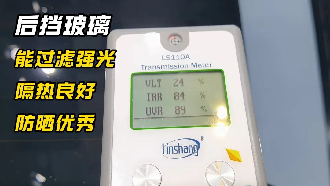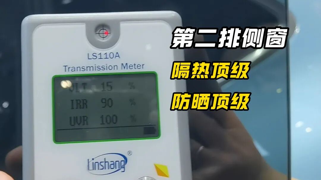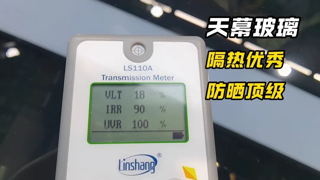 有了前面的惊喜之后我们对智界R7 2025款的天幕玻璃充满期待, 可能期望值有点高,所以测试结果让我们有点略微失望——18%透光率(VLT)和100%的紫外阻隔率(UVR)没有任何问题,唯独90%的红外阻隔率(IRR)对于一块不能开启的天幕来说略微低了点。