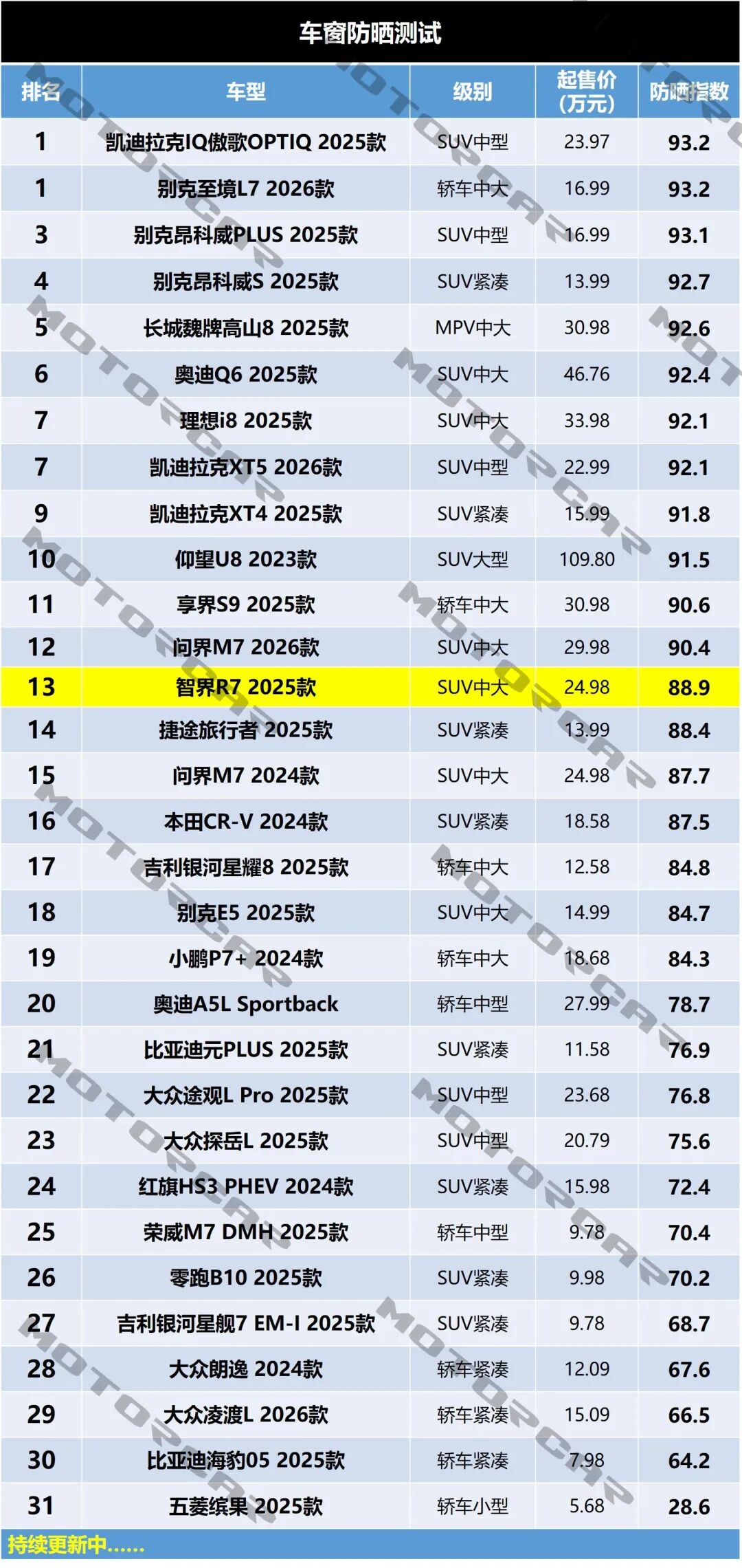按照测试模型计算下来,智界R7 2025款全车防晒指数为88.9分,在目前的测试排名中暂时排名第13。整体看下来其车窗用料除了前挡之外还算不错。