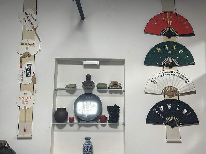 交流中,蔚楠详细了解了徽派扇艺的历史脉络与技艺特从选材、造型到雕刻、绘画,徽派扇艺兼具实用功能与审美价值,其“以扇载道”的文化表达,融合了徽州木雕、石雕的精湛技法与新安画派的笔墨意趣,形成了独树一帜的艺术风格。在专业委员会的展示厅内,他近距离观摩了不同时期的徽派扇艺珍品,包括竹骨扇、檀香扇、漆扇等,对匠人通过扇面方寸间展现山水意境、人文故事的巧思赞叹不已