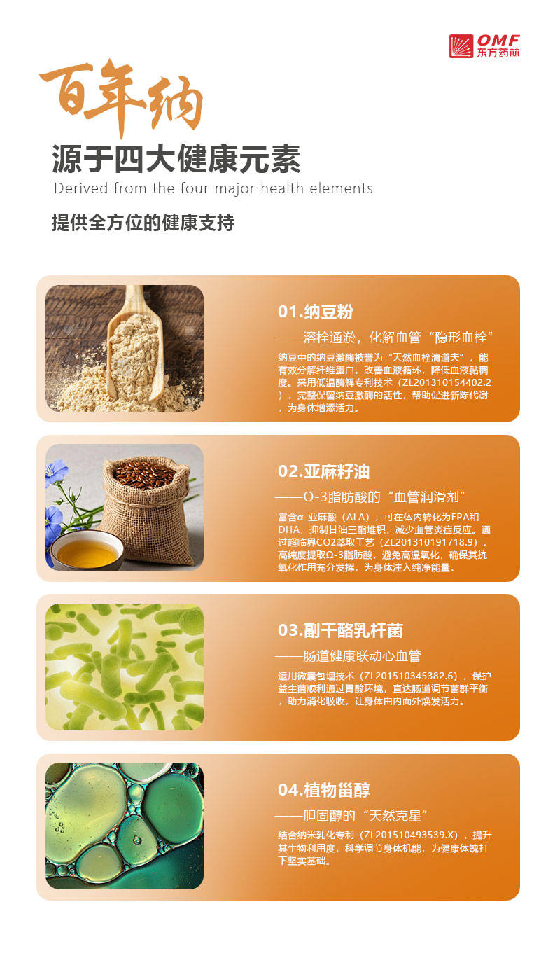 纳豆粉——采用低温酶解专利技术(ZL201310154402.2),完整保留纳豆激酶的活性,帮助促进新陈代谢,为身体增添活力。亚麻籽油——通过超临界CO萃取工艺(ZL201310191718.9),高纯度提取Ω-3脂肪酸,避免高温氧化,确保其抗氧化作用充分发挥,为身体注入纯净能量。副干酪乳杆菌——运用微囊包埋技术(ZL201510345382.6),保护益生菌顺利通过胃酸环境,直达肠道调节菌群平衡,助力消化吸收,让身体由内而外焕发活力。植物甾醇——结合纳米乳化专利(ZL201510493539.X),提升其生物利用度,科学调节身体机能,为健康体魄打下坚实基础。