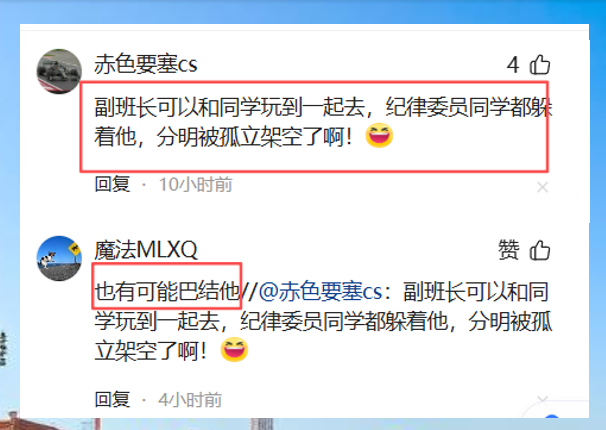 有个评论特别扎心:“副班长可以和同学玩到一起,纪律委员同学都躲着他,分明被孤立架空了啊!”(赤色要塞cs)