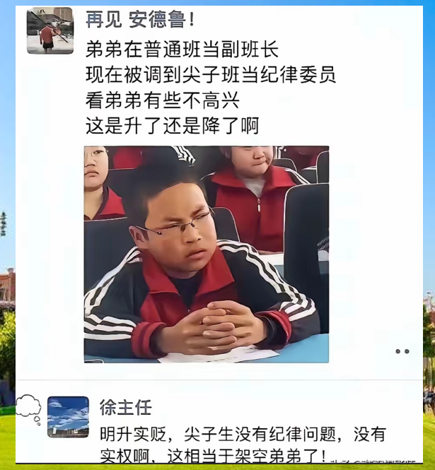 发帖人叫“再见安德鲁”,内容很简单:弟弟从普通班副班长,调到尖子班当纪律委员,看到弟弟不高兴,问大家这是升了还是降了?