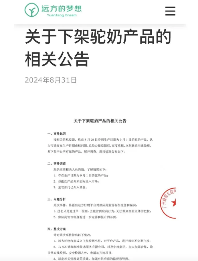 此前,远方好物也曾爆出“早产驼奶”(生产日期早于原料采购日期)、部分有机蔬菜有效成分不达标等品控翻车事件。