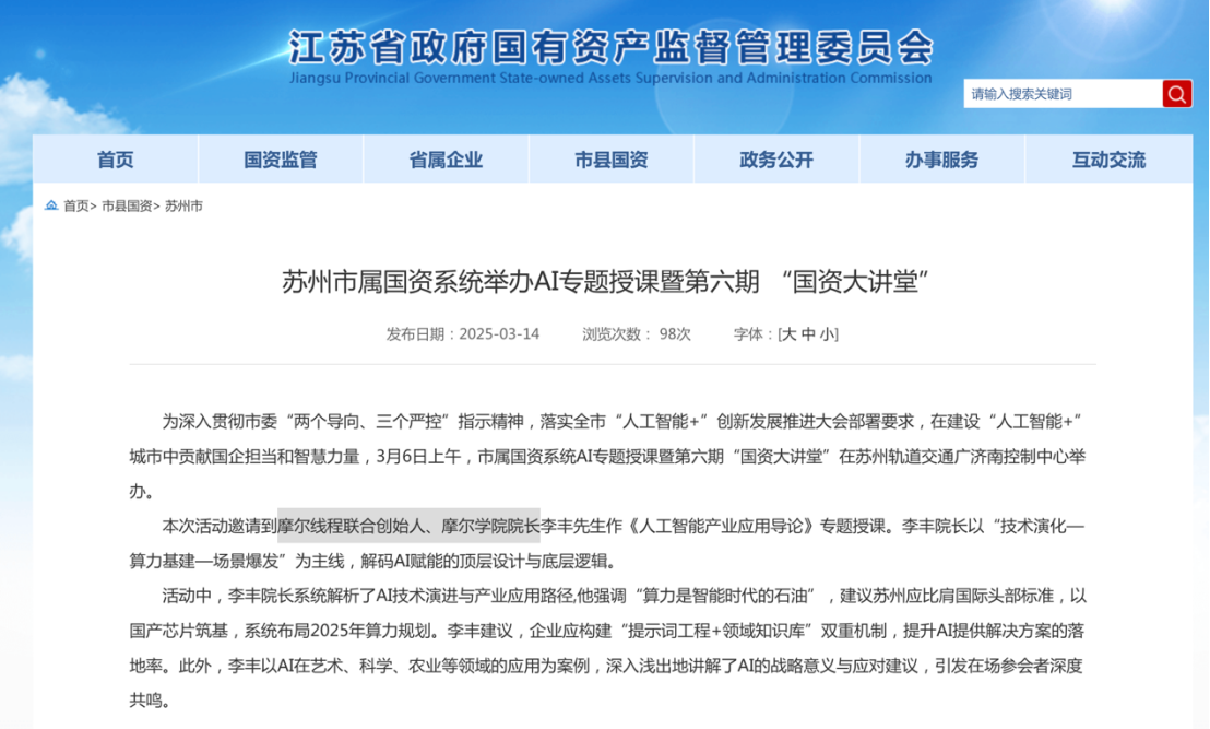 但在一些官方场合,比如在江苏国资委网站上宣传苏州市属国资系统举办AI专题授课暨第六期 “国资大讲堂”的文章中,李丰的职务赫然以“摩尔线程联合创始人、摩尔学院院长”展示。
