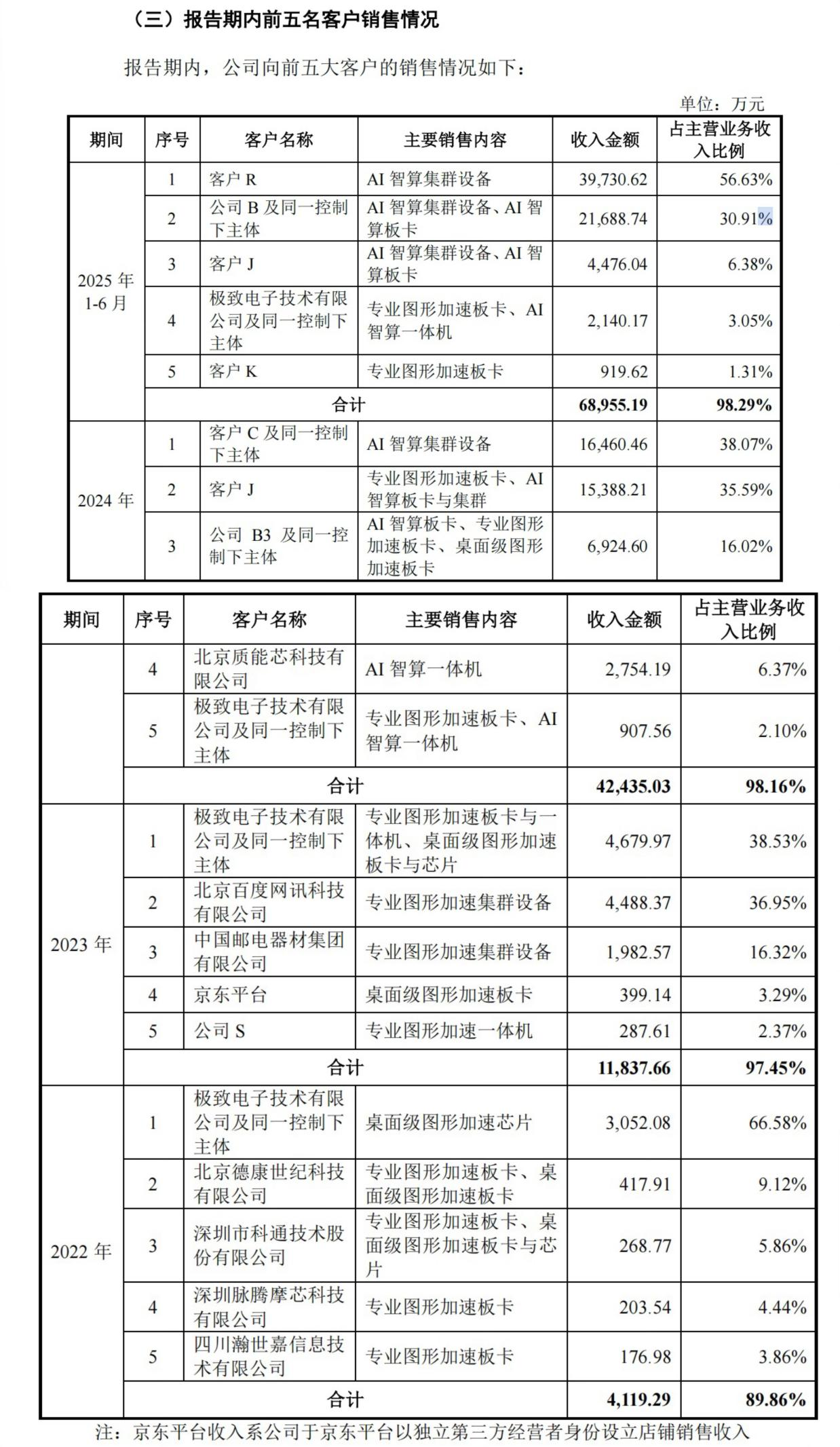而从客户群体来看,摩尔线程自2022年至2025年上半年,前五大客户收入占比分别为89.86%、97.45%、98.16% 和98.29%。尤其在2025年1–6月,前两大客户合计贡献已超过87%的主营收入,其中单个客户贡献56.63%的营业额。这意味着,一旦核心客户采购节奏放缓、预算调整或项目终止,公司的收入与现金流将面临剧烈波动。