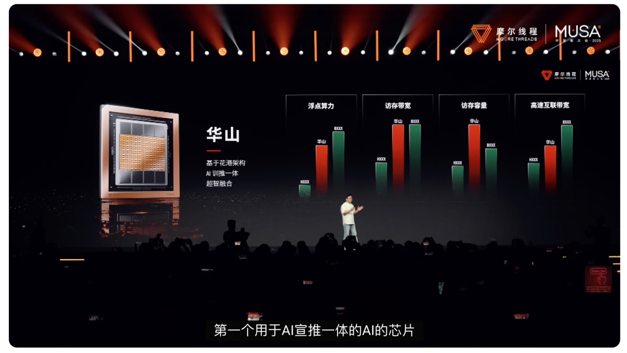 可惜的是,这几项核心产品并未给出关于算力、访存带宽、容量等关键数据,仅靠一张图表,隐晦地传达出“逼近英伟达B系列”的信号,就连张建中发布会现场将产品对标英伟达的大篇幅表述,也在大会结束后的两天被摩尔线程删除。2小时的发布会,最终仅留下10分钟的产品介绍切片。