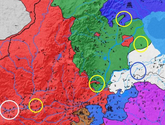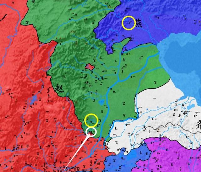 上黄圈为燕都蓟都,图中可见赵军对燕的兼并已经进入了今环首都贫困带,燕国也陷入了危在旦夕的窘境。