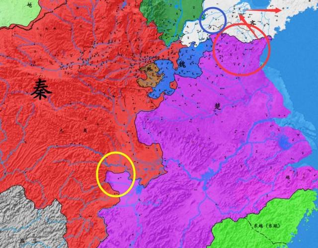 从图中可以直观地看到,在魏国被消灭以后,楚廷已经失去了最后的屏障,而齐人在历下的压制下不太可能有什么大动作,更何况齐廷上层也已被秦国的间谍网所渗透,此时秦、楚之间也陷入了“单对单”的状态。