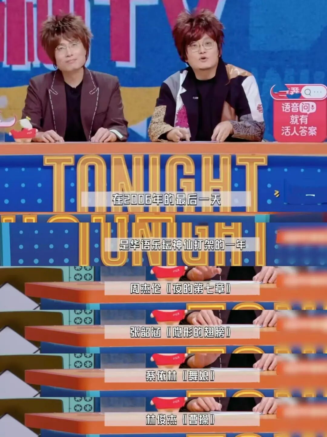 接下来的《非要播报》里,播报员周奇墨和王建国也把这种“复古风”延续了下去,顶着一头20年前盛行的杀马特爆炸头,一本正经地盘起了2006年的娱乐新闻,当《夜的第七章》《舞娘》《武林外传》《超级女声》这些名字被提起时,小鱼还真有一种,小时候晚饭后守着电视看娱乐新闻播报的感觉,在那个没有智能手机、只有周末经过允许才能玩电脑的时代,这是每个80后、90后都乐此不疲的吃瓜方式。