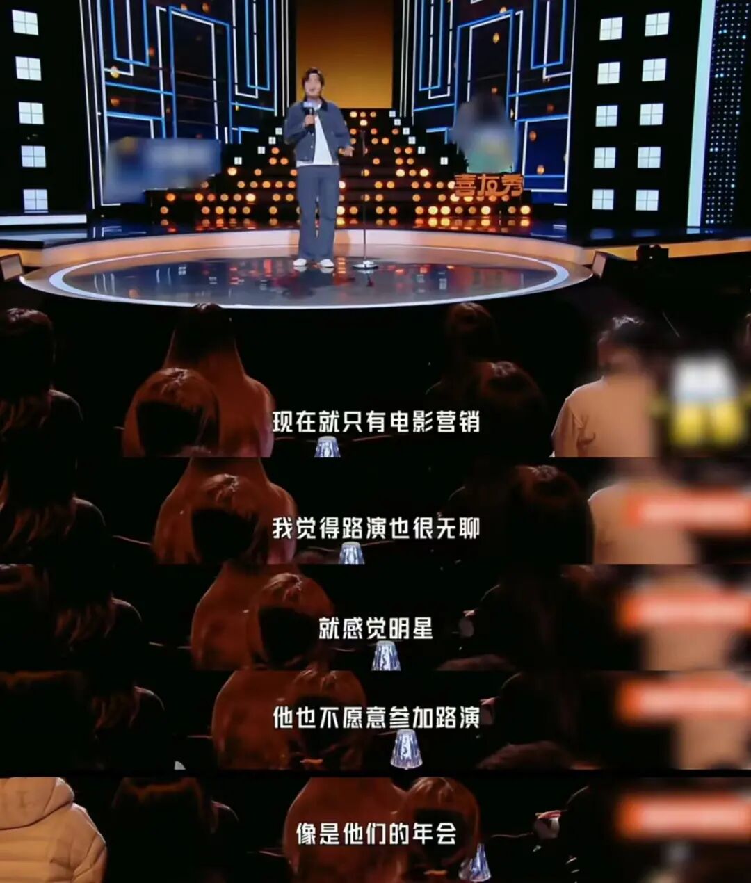 继第一期节目里“最憋屈大王”翟佳宁疯狂输出,吐槽自己没商务、是李逵抢了武则天的戏之后,这一期的节目居然还在上“背刺”内娱的强度。先是刘仁铖直接对桃、鹅两家平台进行无差别开火,抱怨现在的真人秀节目都千篇一律,搞来搞去全是明星跑到世界各地玩你画我猜,他们这帮脱口秀演员拼尽全力就是为了得到一个去玩你画我猜的机会。接着林简七也火力全开,开怼现在的电影路演、营销太套路,片场切片里导演每天要被老戏骨的演技震惊一百次。