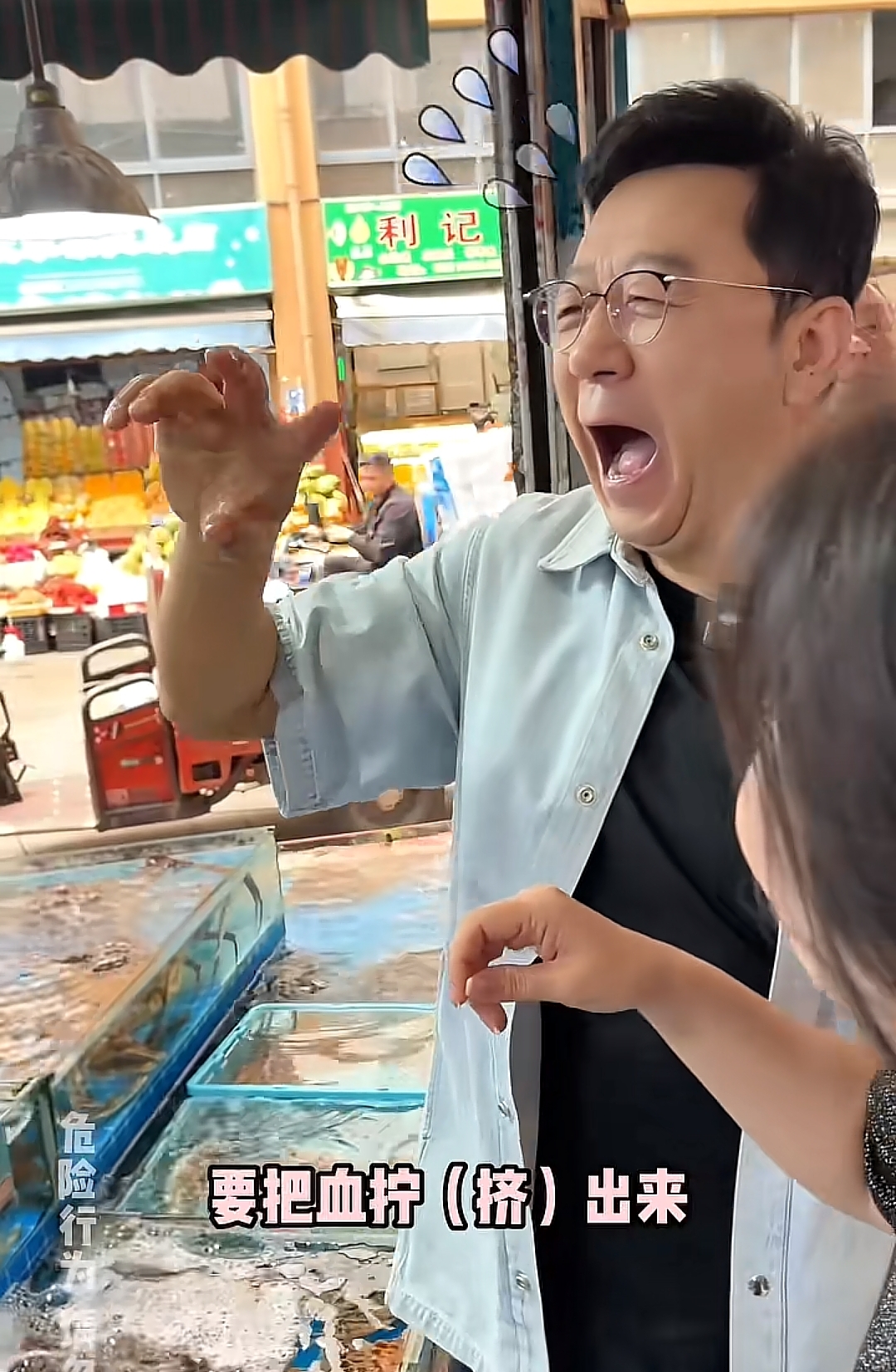 根本不会下厨的郭涛,一进到市场的海鲜区就好奇得不行,一会捏捏这个,一会摸摸那个,结果抓皮皮虾的时候就被扎了,疼得他直大叫。