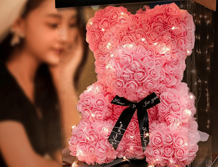 礼盒采用透明材质,让花朵和玩偶都能清晰呈现,背景中柔和的灯光装饰进一步提升了整体的浪漫氛围。这样一款礼物,不仅适合作为生日礼物,也很适合七夕、情人节等特殊时刻赠送,让对方感受到你的用心。