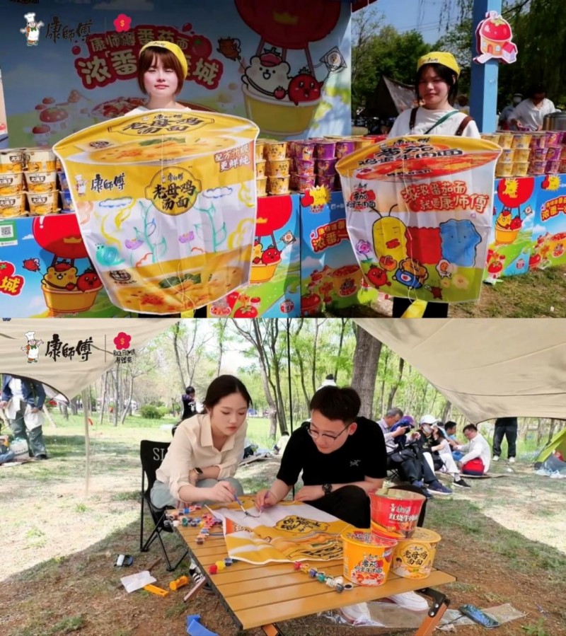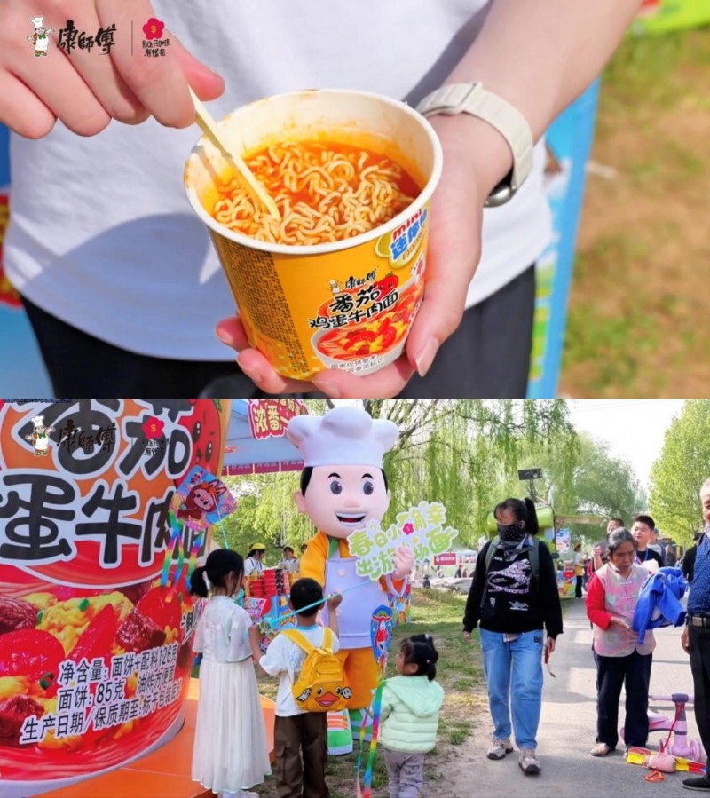 这次,康师傅带着「春日小确幸,出游大场面」主题展位强势入驻,直接解锁春日双重快乐:线下热乎泡面随心炫,趣味风筝涂鸦随便玩,天上飘着巨型泡面风筝霸气显眼,地上热气腾腾的泡面香气扑鼻,康师傅属实是把春日出游的氛围感狠狠拿捏了!
