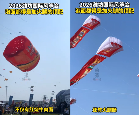 这次天空重磅双杀,康师傅巨型泡面风筝联手双汇火腿肠风筝同步升空,两大国民顶流组团上天营业,梦幻联动直接引爆全场,网友直呼:泡面火腿顶配CP,终于一起飞上天了!