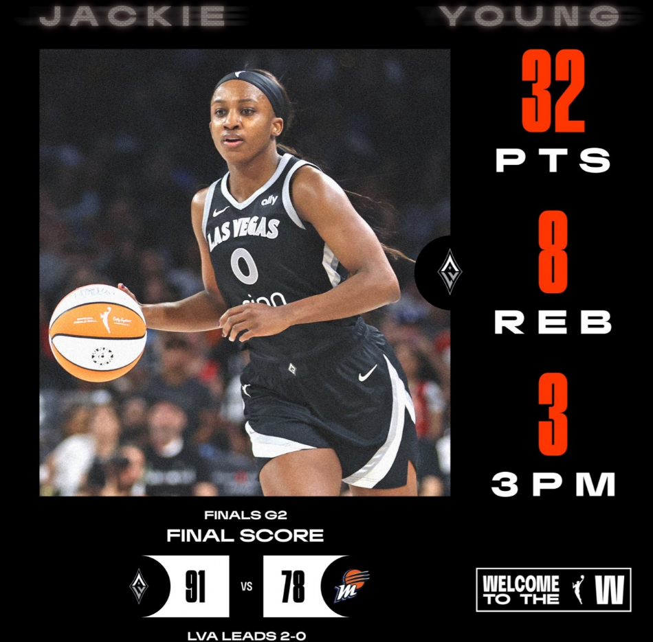 总决赛G2中,拉斯维加斯王牌主场以91-78再胜菲尼克斯水星,总比分2-0领先。杰基-杨第三节狂砍21分,创下WNBA总决赛单节得分纪录,全场轰下32分追平个人季后赛得分新高。阿贾-威尔逊同样表现全面,贡献28分14篮板,彻底统治内线。