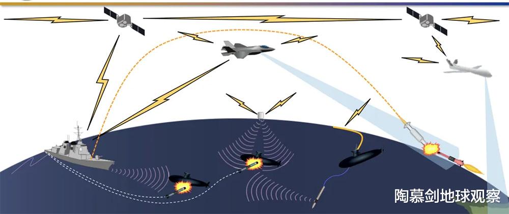 第四层,海底界面,这是整个网络的支柱,通过海底电缆连接和承载无源阵列、精确时钟和导航信标,可为来访的水中载具提供必要的对接、数据卸载甚至是充电,能够使无人潜艇长期潜伏于水中,大大延长续航时间而不必浮出水面。