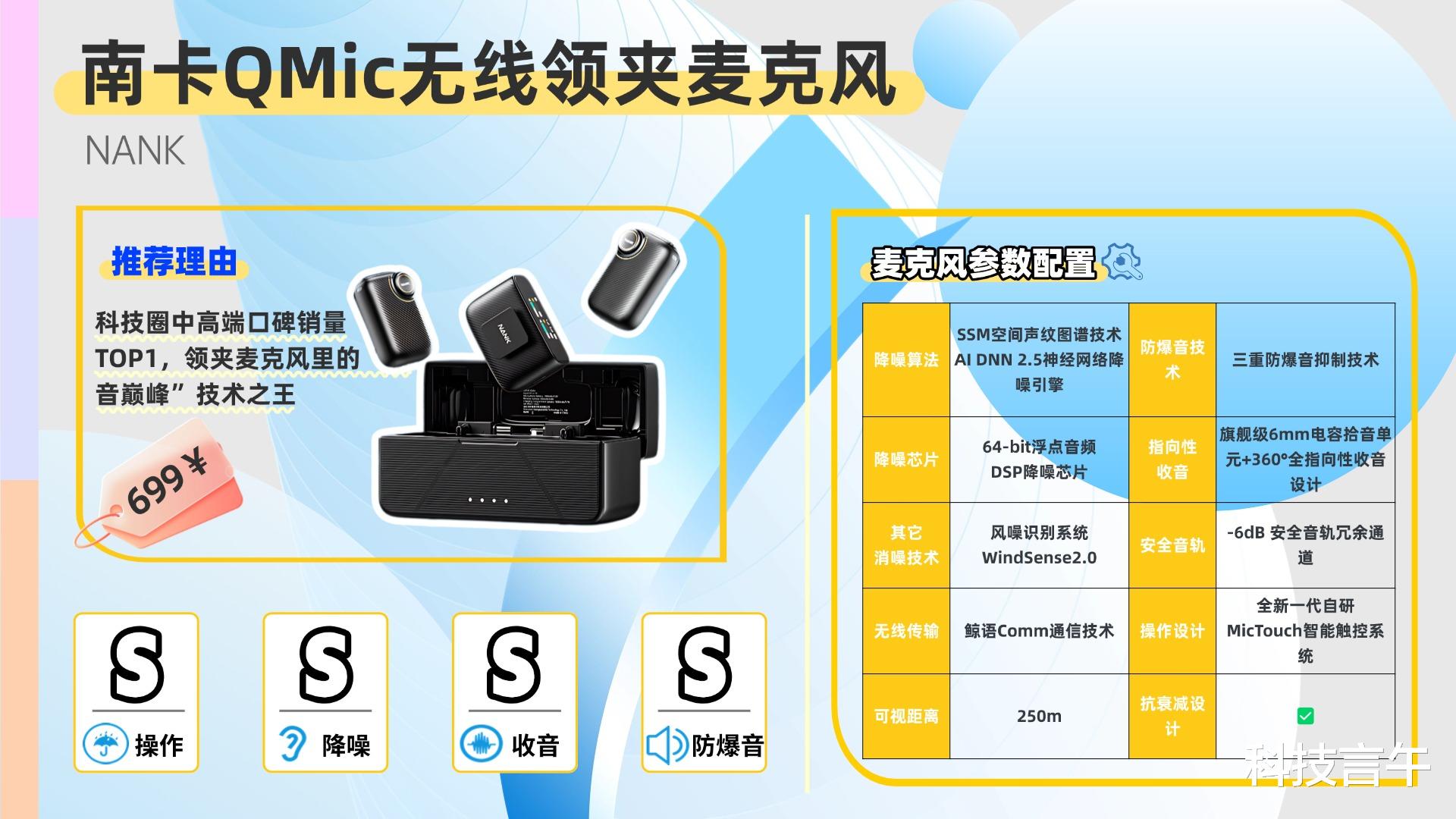 并且南卡在QMic的材料与配置上追求极致,支持单声道 / 立体声录制模式灵活切换,适配多场景创作需求(单人独白、双人采访、实况混音),并搭载-6dB 安全音轨冗余通道,在主轨意外爆音失真时,自动保留一轨干净备份,保障关键语音信息不丢、不炸、不废片!双核DSP并行架构保证长距离无线传输低延迟、少丢包,三重防爆音系统通过结构优化、实时声压识别与波形修复,将爆破音削减超过90%。48kHz采样率+24Bit位深带来录音棚级音质,人声还原度高达98%以上,鲸语Comm通信技术支持250米稳定收音,堪称千元级领夹麦克风的巅峰之作。