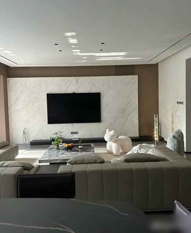 像通铺瓷砖配同色美缝,地面像一整块石板,拖地省事还显大;无主灯设计用射灯加灯带,光线均匀铺开,比吊灯更显层高。