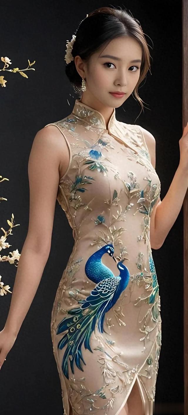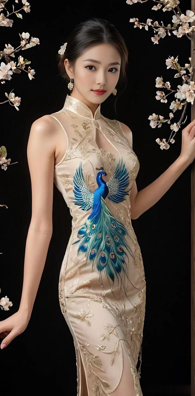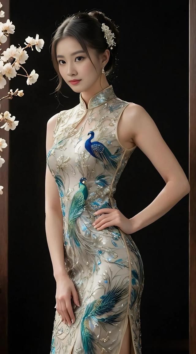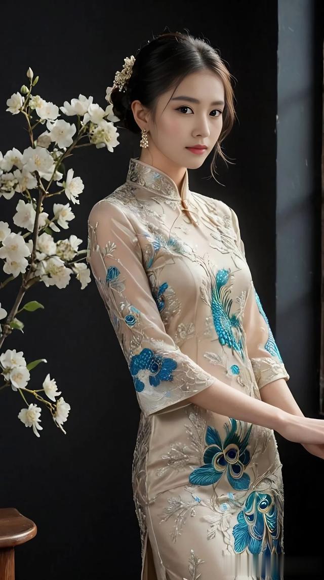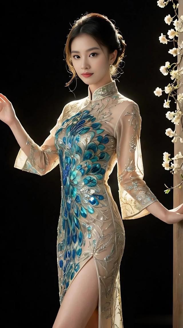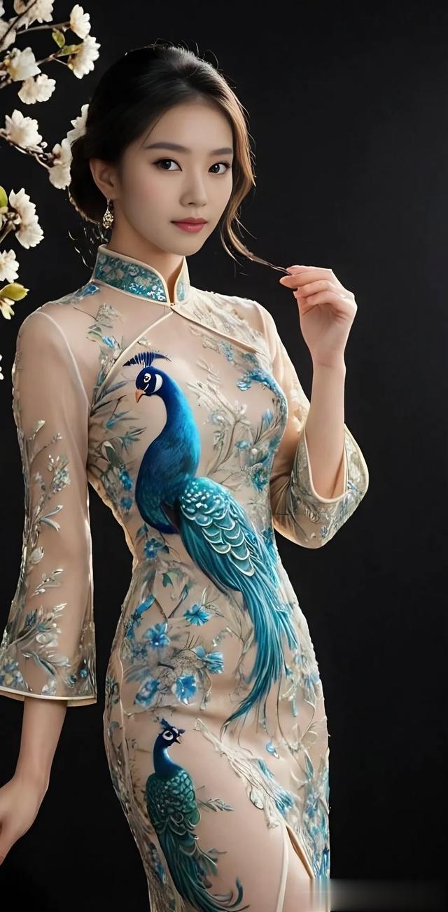 一袭旗袍,是东方美学的具象化。那些精美的孔雀刺绣,以蓝绿为主色调,在面料上栩栩如生,似要振翅。