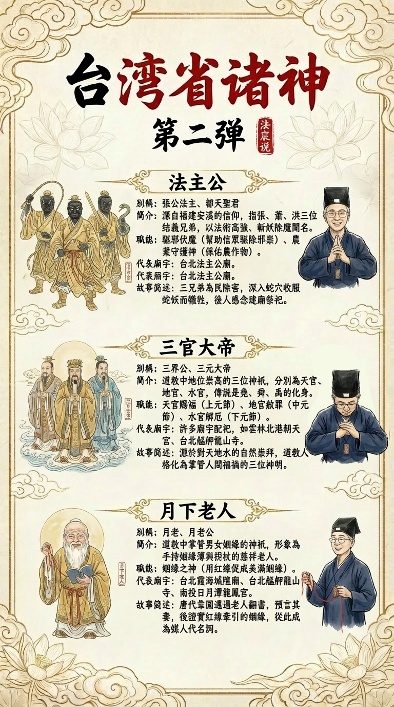因为第一期(台湾省诸神)的笔记爆火啦,感谢各位小友能喜欢小道分享的内容(给各位行礼了),一方面在评论区等也收到了大家不少的建议和新的神明的补充,经过两天的信息和典籍搜集以及调研,再次整理了更多的台湾省比较经常供奉的神明给大家分享和介绍,当然我们不谈其教与玄相关的话题,仅仅作为知识分享和大家一起讨论学习,那现在和我一起看看有哪些是之前没有给大家介绍到的吧!(图文之后有文字介绍,书写仓促,可能存在勘误,还请见谅)