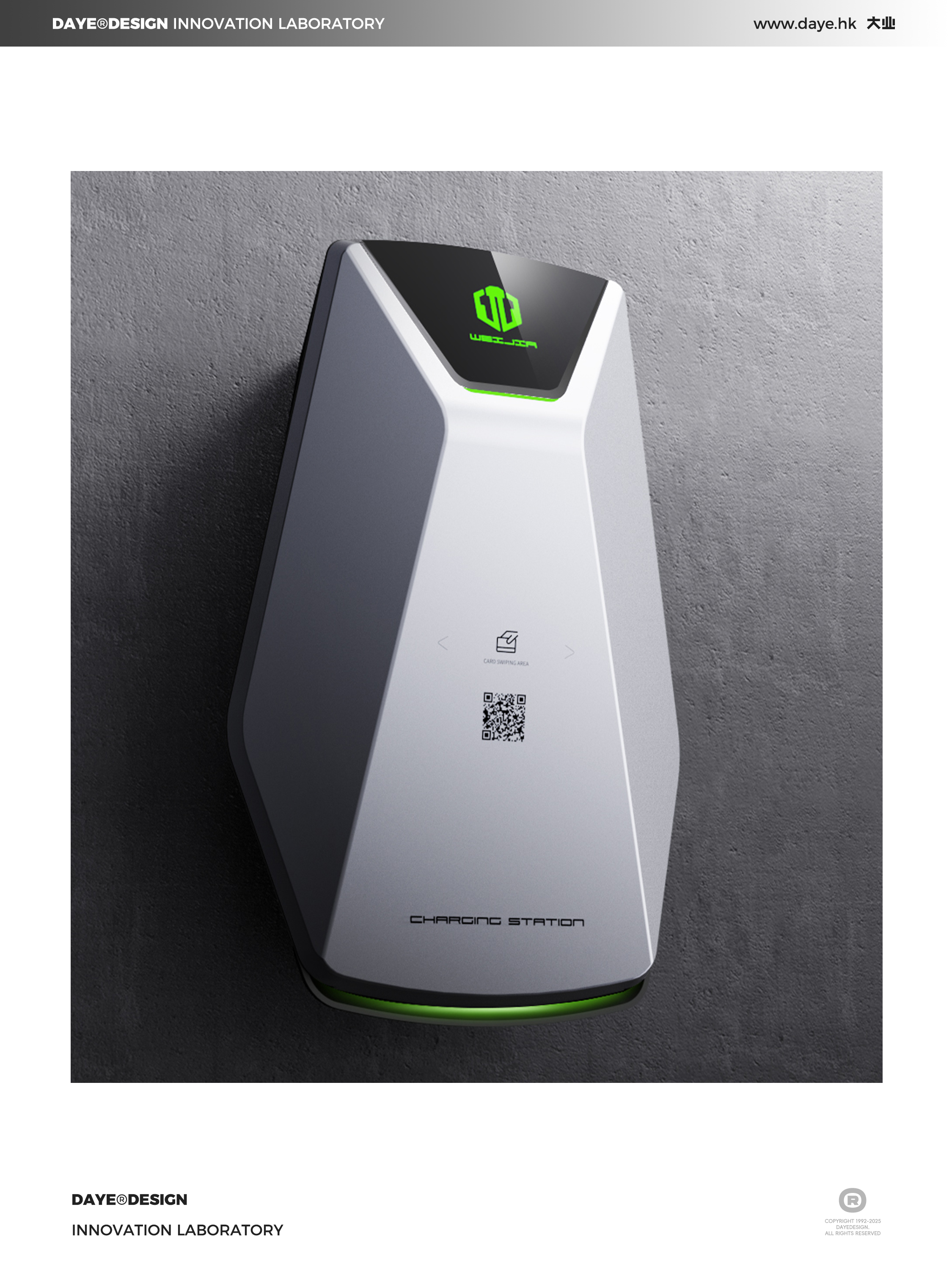 产品采用多面几何切割的造型逻辑,摒弃传统充电桩的 “方正笨重感”,通过锐利的棱面拼接,塑造出极具 “未来工业美学” 的视觉形态。 银灰色主体采用哑光金属质感材质,既传递工业产品的坚固可靠,又通过 “哑光” 质感弱化冰冷感,提升与环境的融合度。
