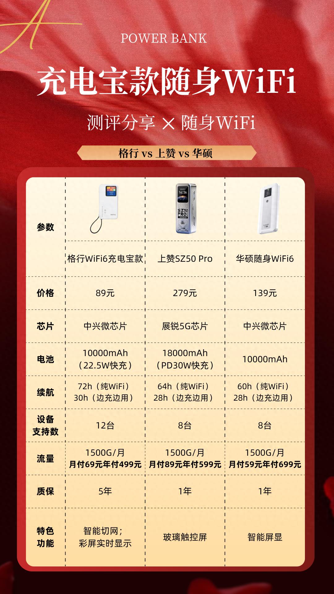 今天我们拿到三款市面上热度较高的产品——格行WiFi6充电宝款、上赞SZ50 Pro和华硕随身WiFi6,从价格、芯片、续航、流量套餐及售后保障五个维度,来一场硬核实测对比。