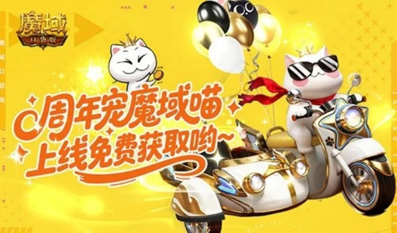 在今年周年庆版本中,该角色迎来3D化升级,推出“霸总喵皇发型”“鎏金喵皇坐骑”等外观内容,其中“魔域喵同款小摩托”作为可骑乘道具上线,玩家可在游戏内的卡诺萨城场景中使用。