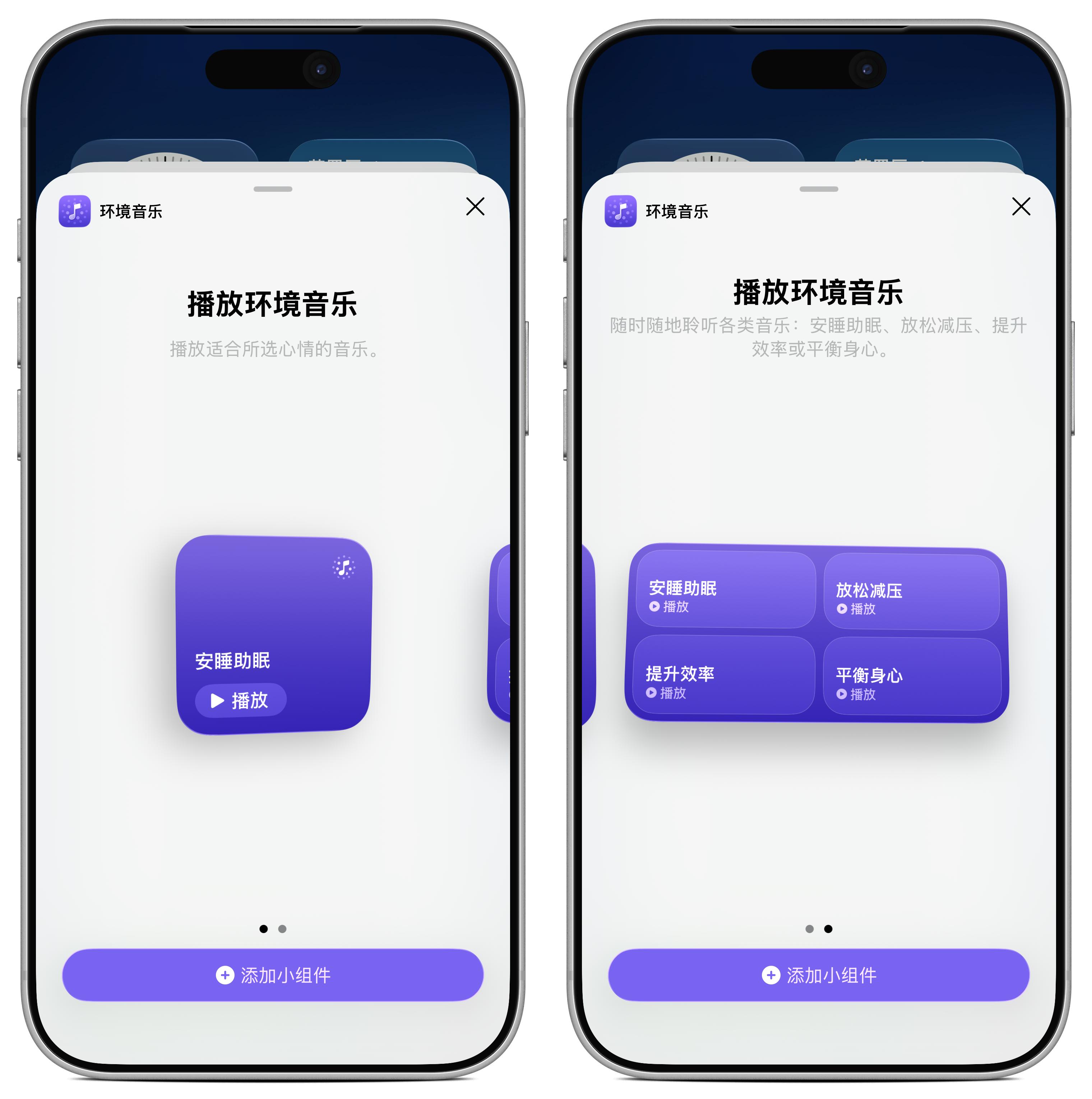 环境音乐小组件iOS 26.4 新增「环境音乐」小组件,可添加到主屏幕和锁屏。目前提供两种尺寸,方便快速播放白噪音。
