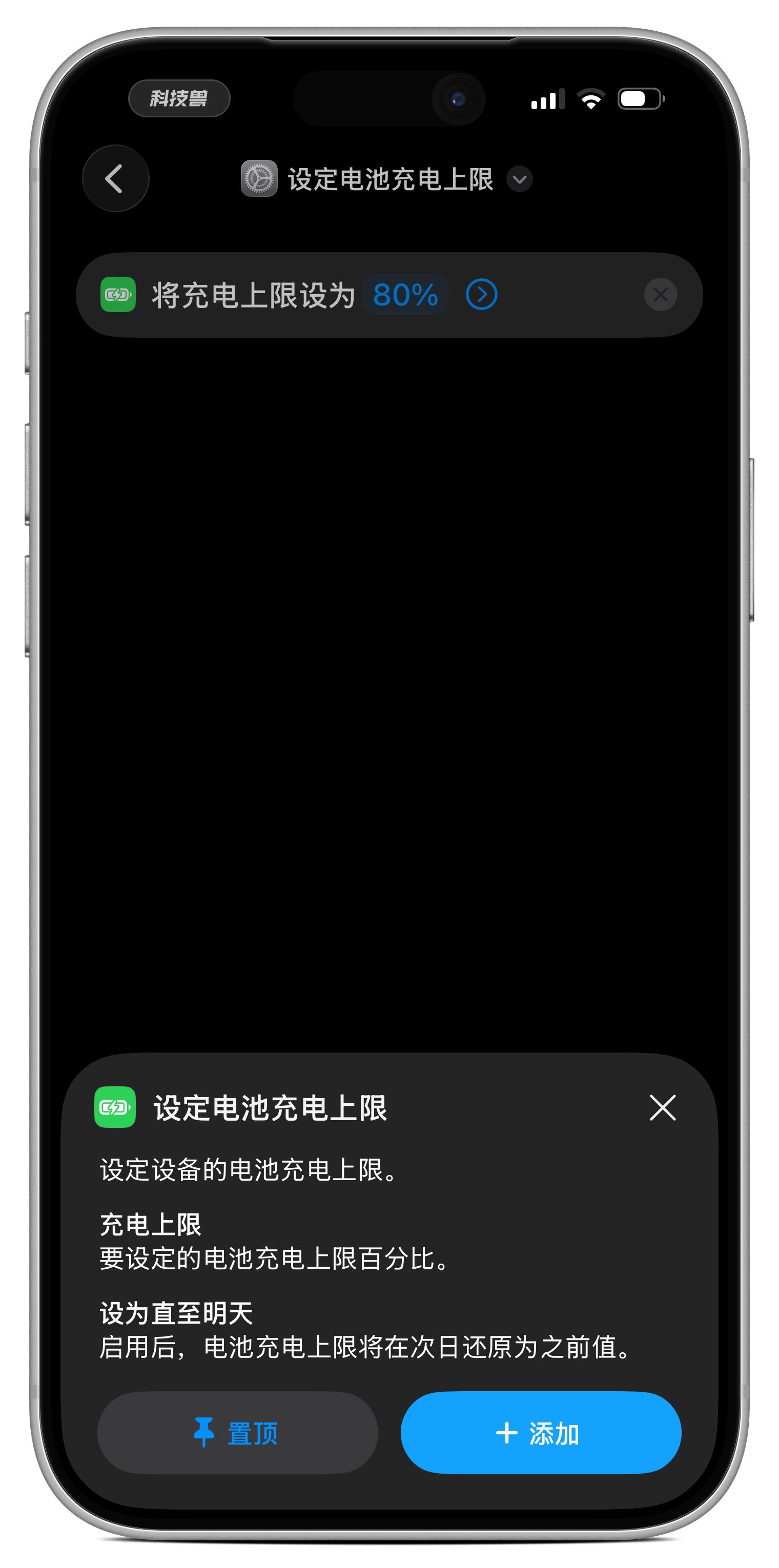 充电上限快捷指令 快捷指令 App 新增了「设置充电上限」的操作,你可以通过自动化实现更灵活的充电关闭,比如根据地理位置(如到公司自动设为 80%,在家设为 100%)自动切换充电档位。