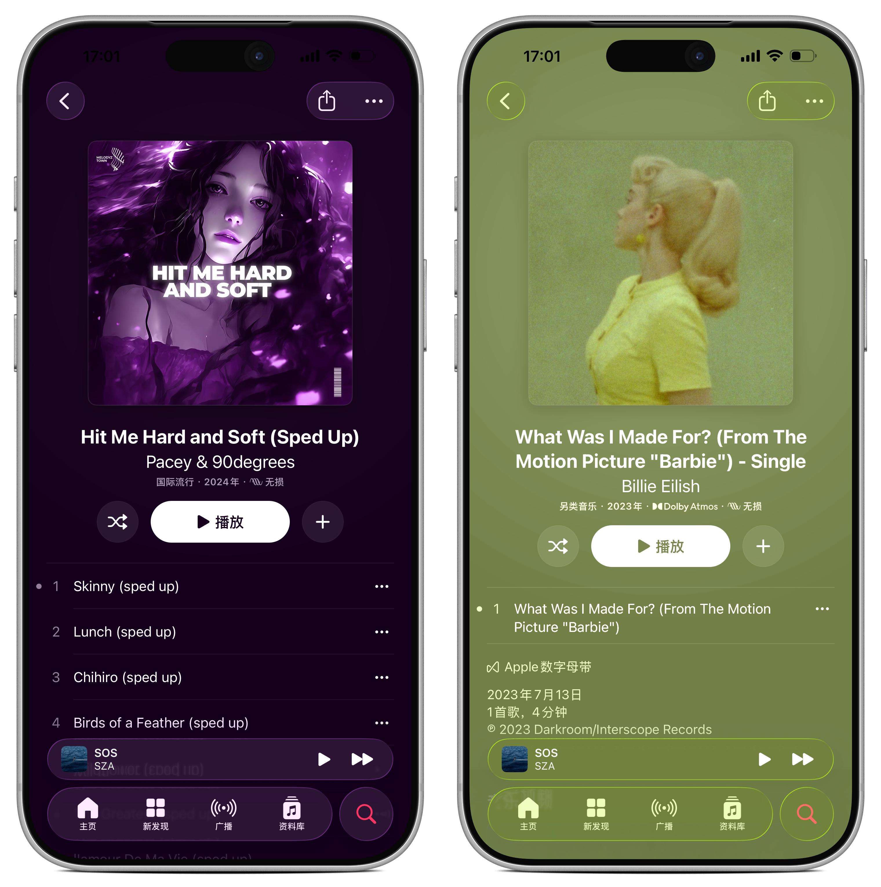Apple Music 变化 Apple Music 本次有多项界面及功能更新,如查看专辑或歌单时,背景会根据封面自动适配,用起来会更具沉浸感: